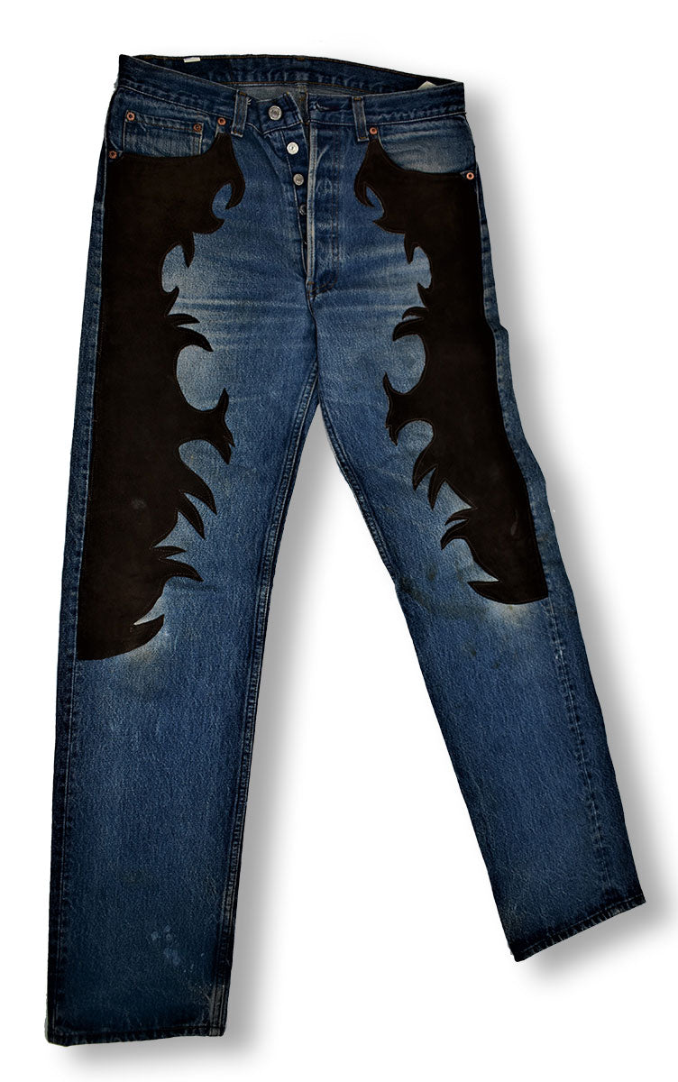 Pair of blue Levi's Button Fly jeans customized by Street Boys Original American Wear. This pair features western-inspired leather accents down both legs and on the back, with Street Boys brand patch on the back. From the Joe Elliott collection.