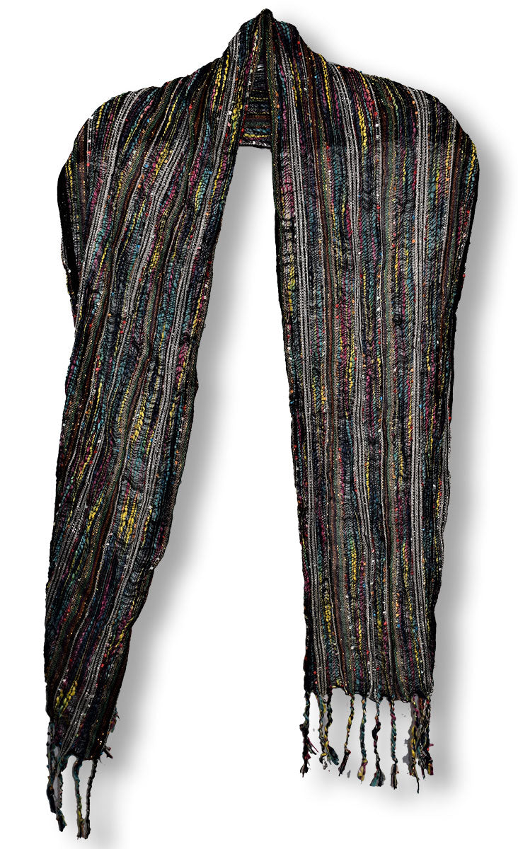 Stylish, multi-colored scarf with metallic fibers and fringed ends. From the Joe Elliott collection.