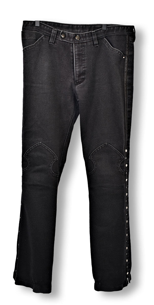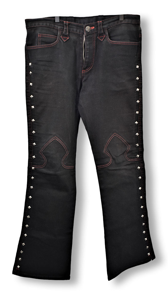 Pair of black jeans from Ray Brown featuring flat studs and a spade design from the knees down. Ray Brown is an Australian designer behind some of 80s metal's most memorable outfits, and given these jeans, it's clear to see why! From the Joe Elliott collection.