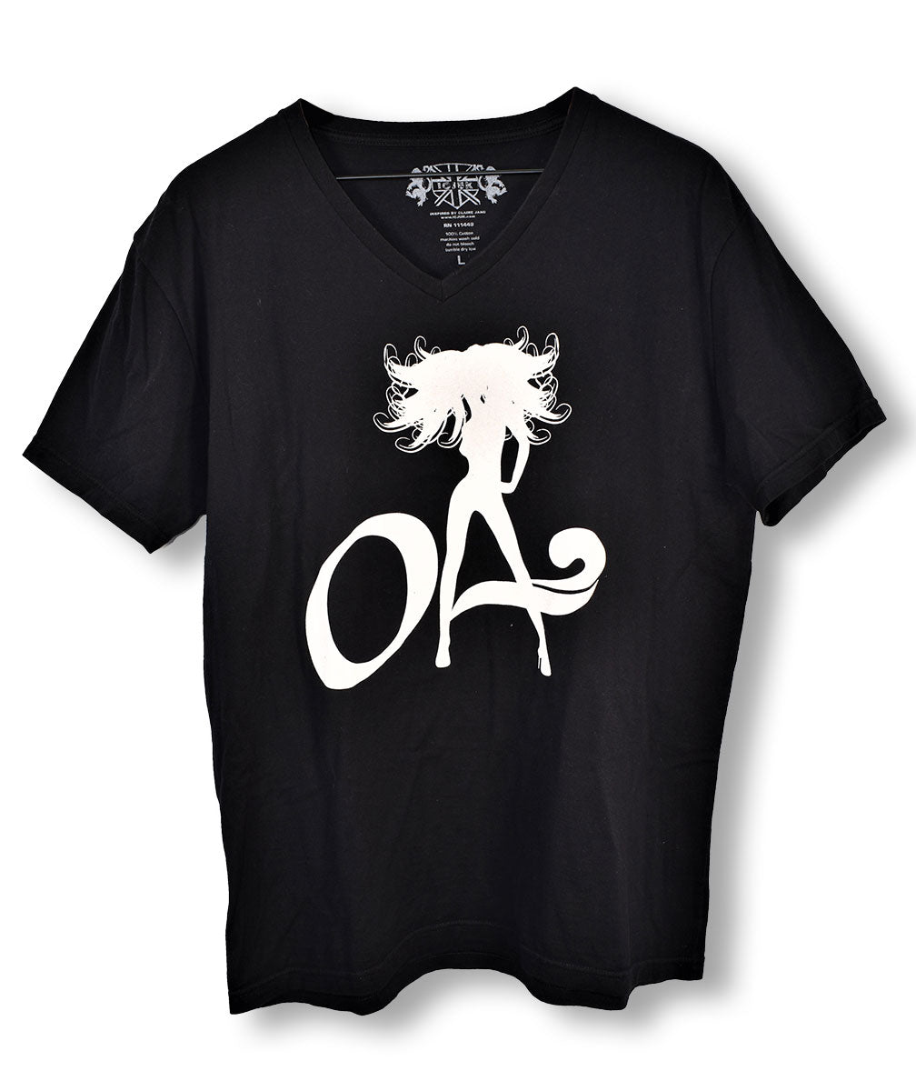 More ICJUK brand from Joe Elliott's closet, this time a black Ocean Anarchy t-shirt featuring the silhouette of a woman making up the white "OA" on the front. Worn in 2005. From the Joe Elliott collection.