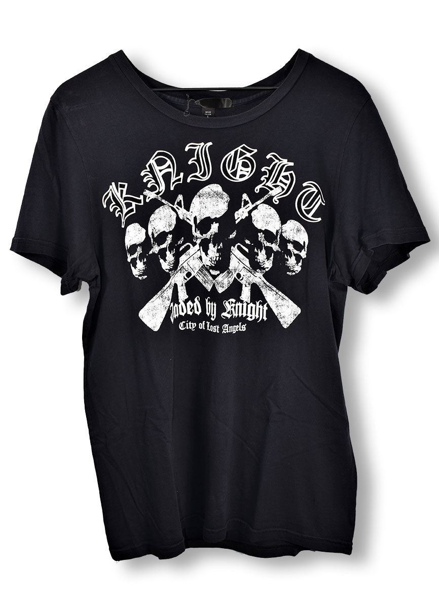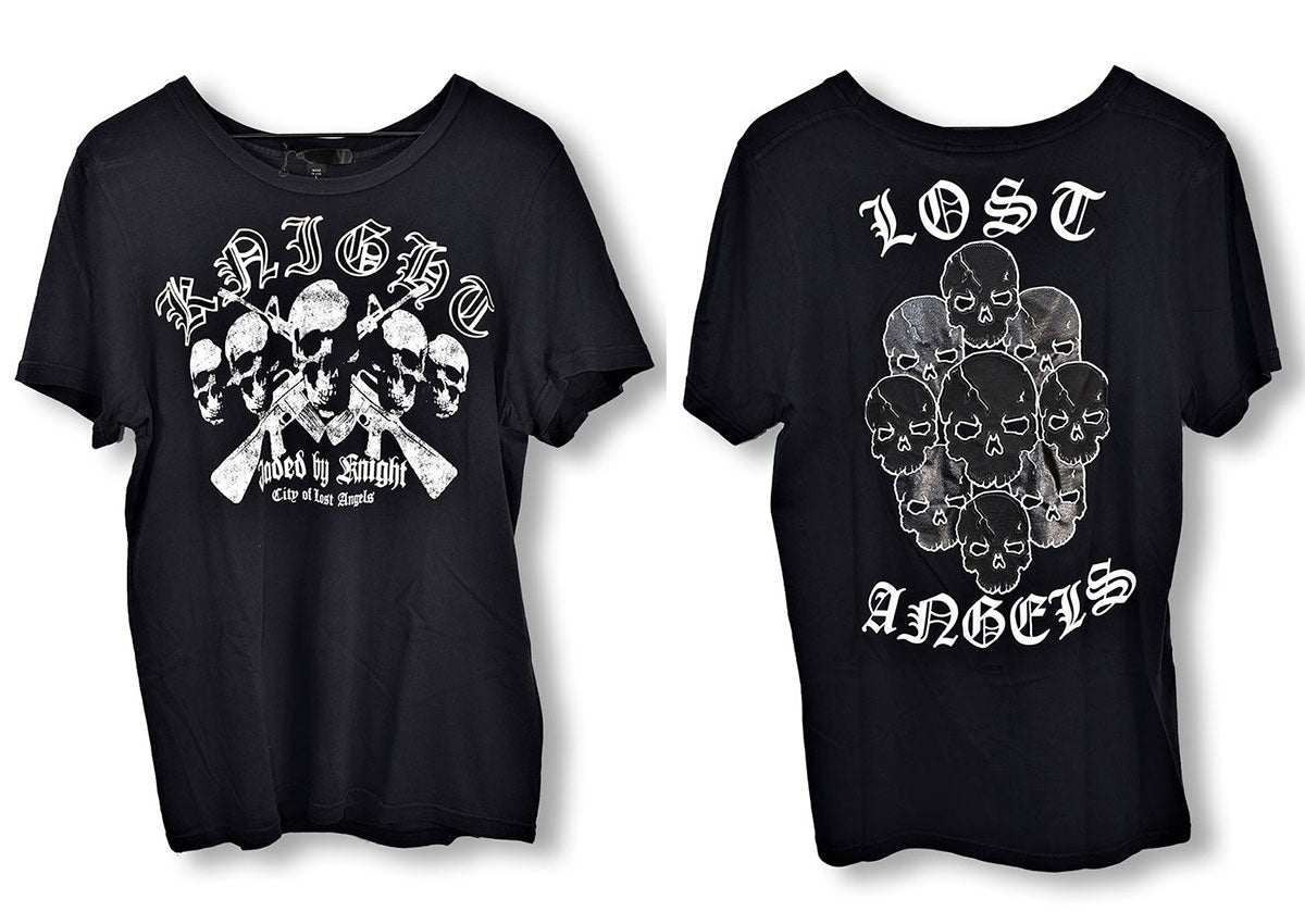 Navy blue t-shirt from "rock luxury" brand Jaded By Knight featuring skulls over assault rifles and "Knight Jaded by Knight City of Lost Angels" on the front, "Lost Angels" and 9 more skulls on the back. Worn on the KISS tour in 2014. From the Joe Elliott collection.