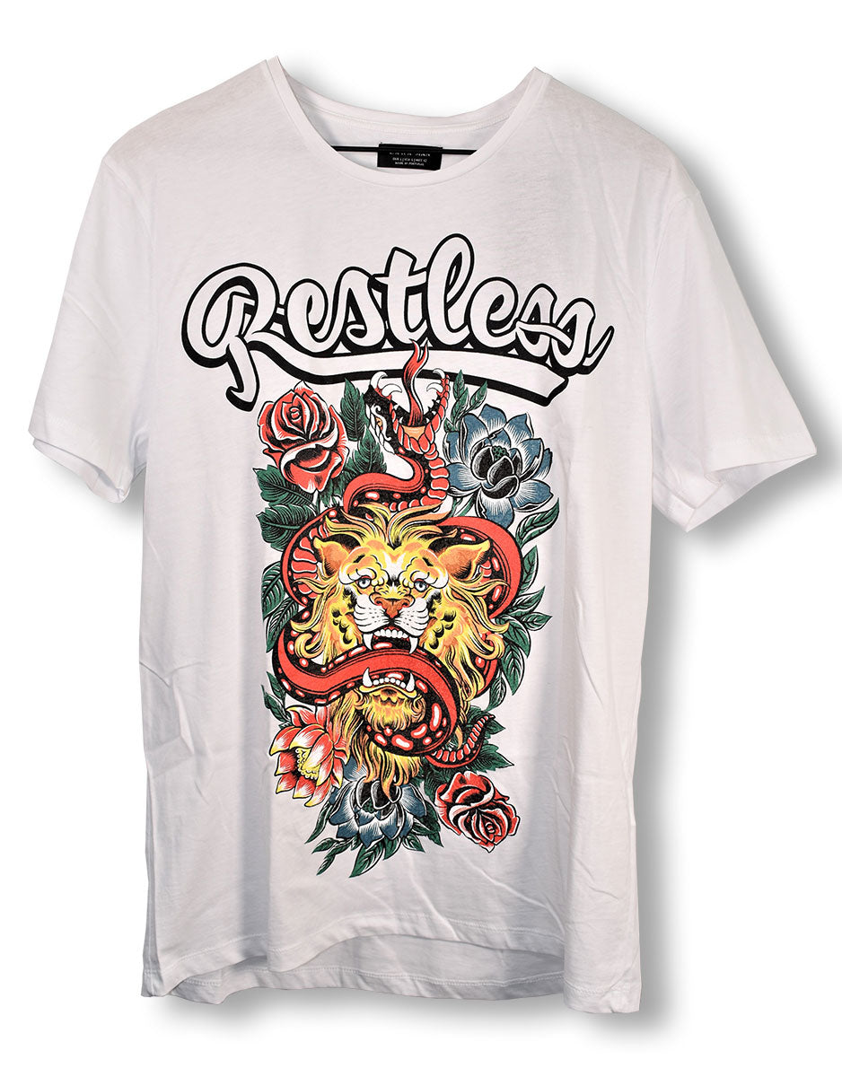 More Zara from Joe's closet, this time a super stylish white t-shirt featuring the struggle between lion and snake over a bed of rose and lotus flowers with "Restless" scripted above. From the Joe Elliott collection.