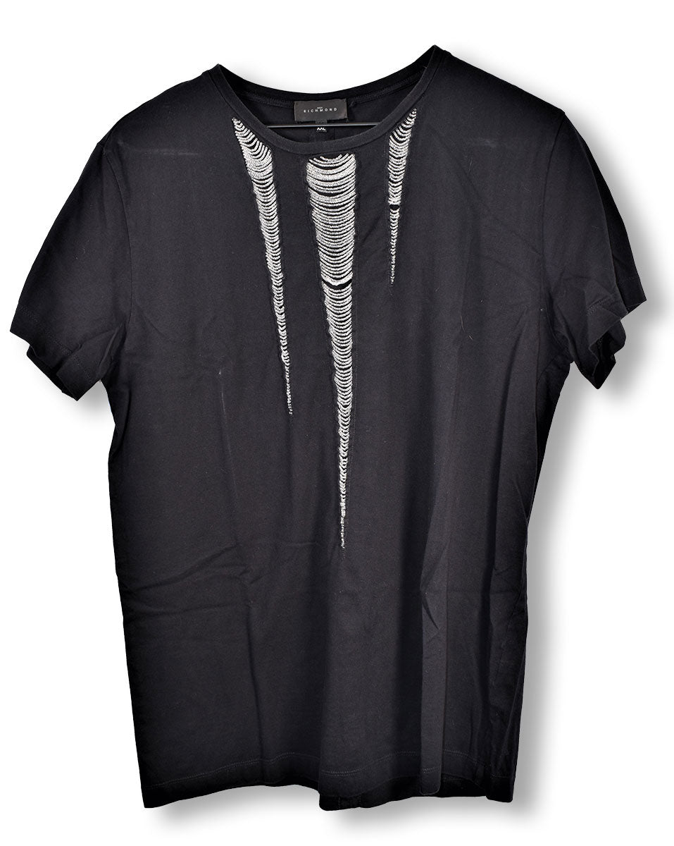 Joe Elliott's black t-shirt with beaded threads stitched through three slashes down the chest by British rock-wear designer John Richmond. Worn in 2012/13. From the collection of Joe Elliott.