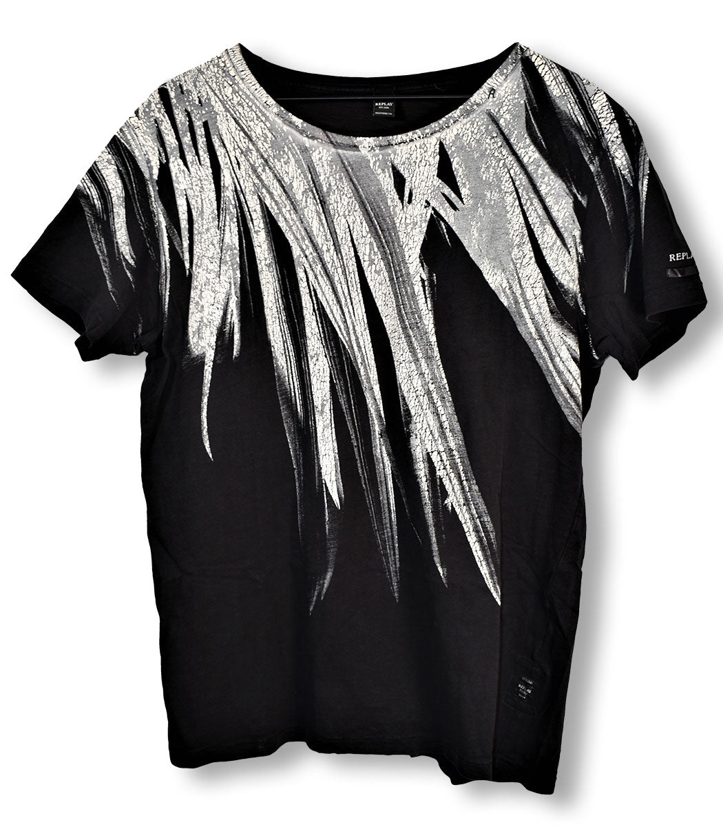 Joe Elliott's black tee with white and grey paint stroke design across the front by Original Replay. Good condition. Worn in 2007/08. From the collection of Joe Elliott.