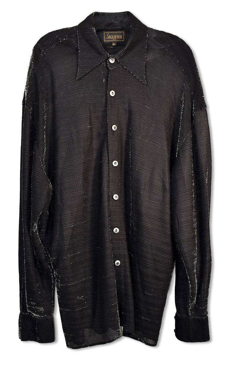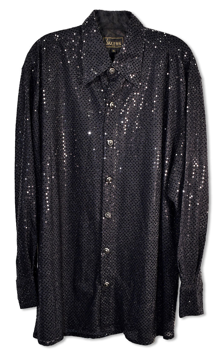 Black sequined button-down shirt, long sleeves, by Saxifon. Worn in 2003. From the collection of Joe Elliott.