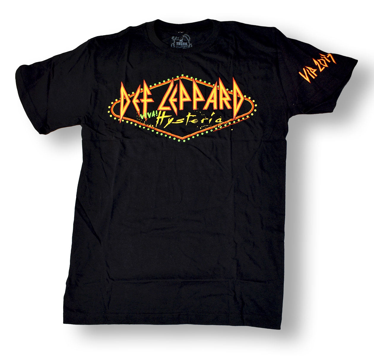 Black VIP Viva! Hysteria tee. This shirt commemorates Def Leppard's Vegas residency and 2013 performances at The Joint at the Hard Rock Hotel & Casino. From the collection of Def Leppard.