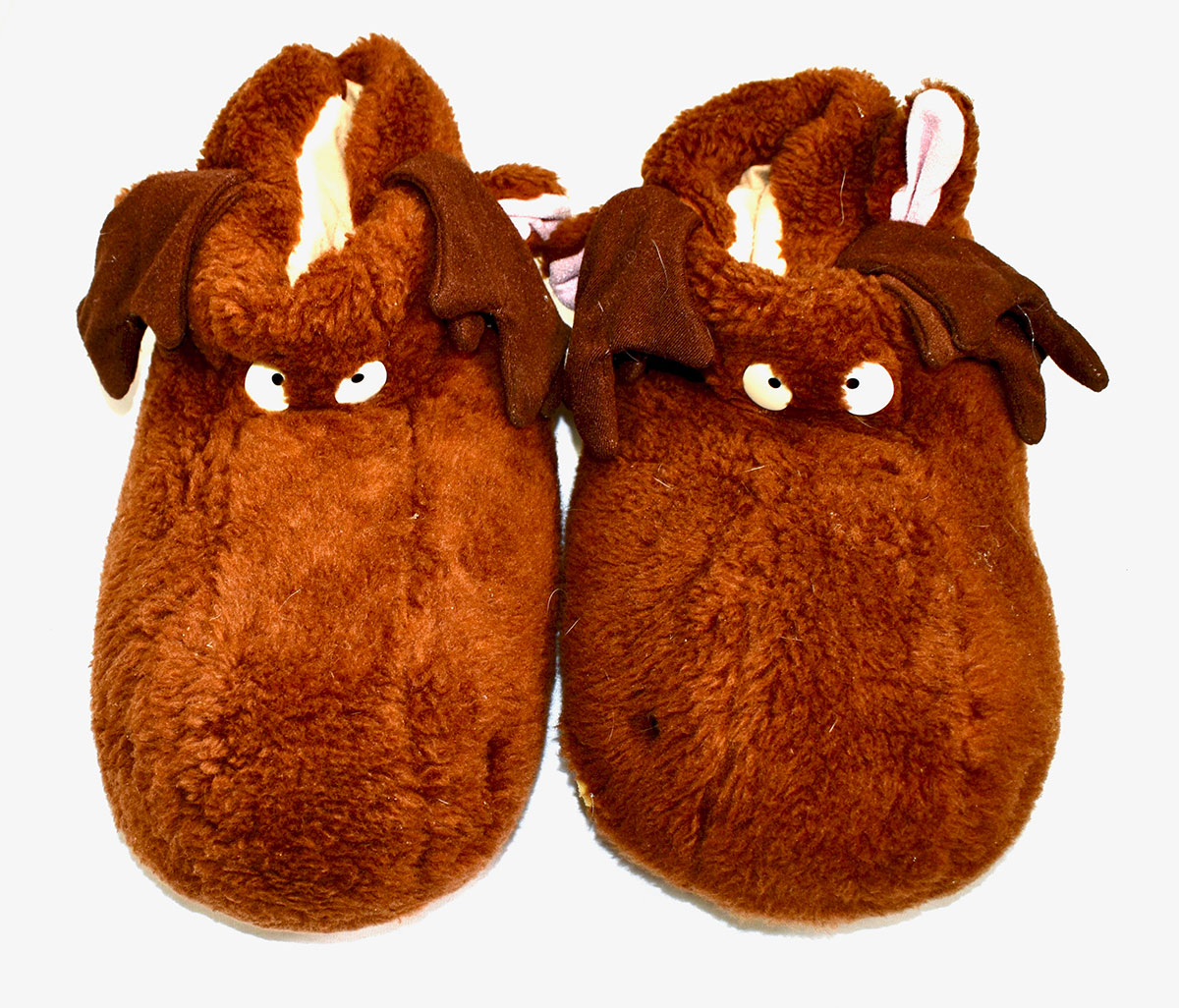 Phil Collen's own well-loved, and well-worn fuzzy moose backstage slippers. Made for comfort and for fashion, these moose(s) graced many a legendary venue behind the scenes, giving some much-deserved soothing to Phil's feet after long nights of rocking. From the collection of Phil Collen.