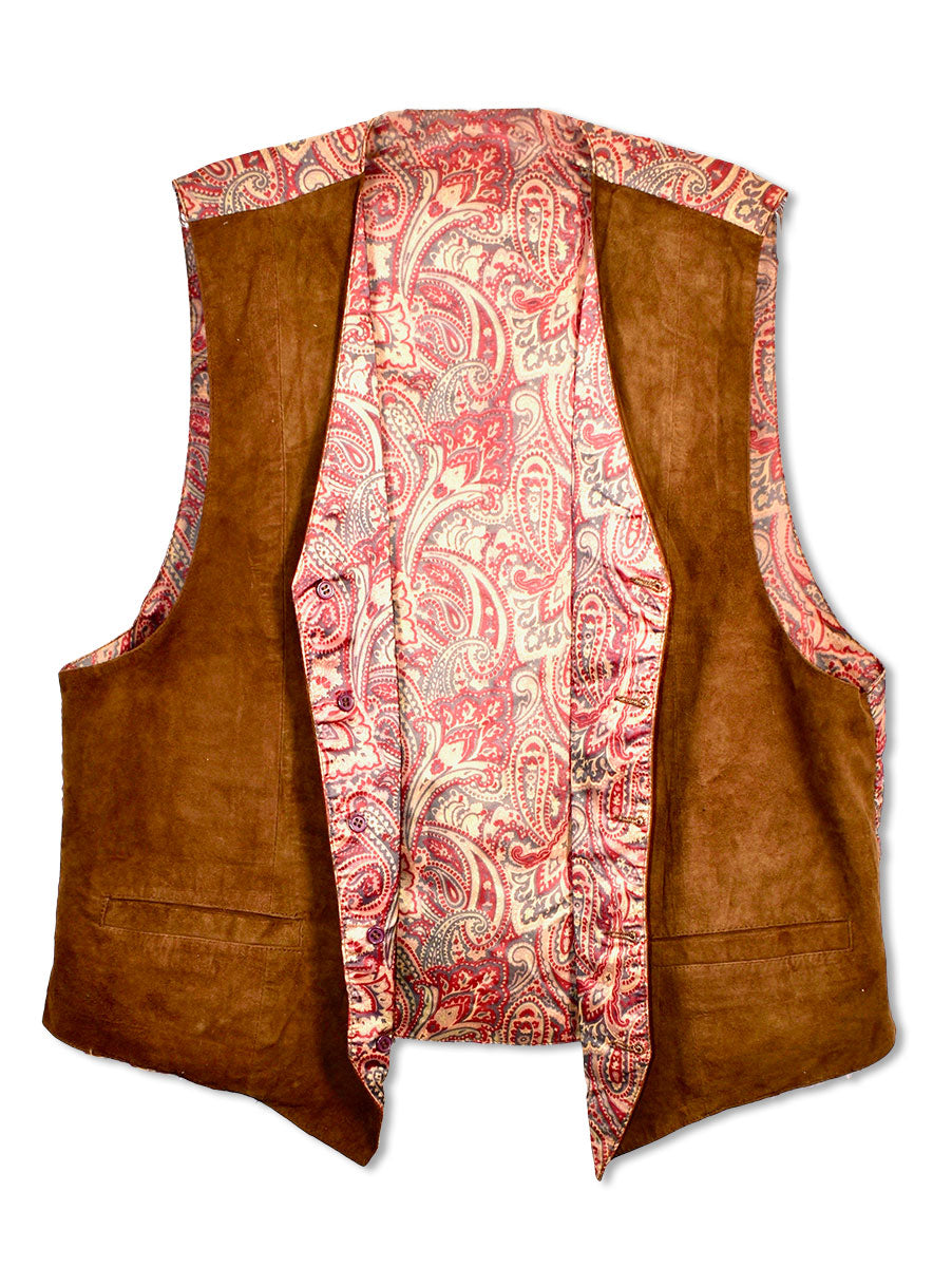 Rick Allen's brown leather 5-button waistcoat with paisley back and lining. Well-worn in, but still in good condition. From the collection of Rick Allen.