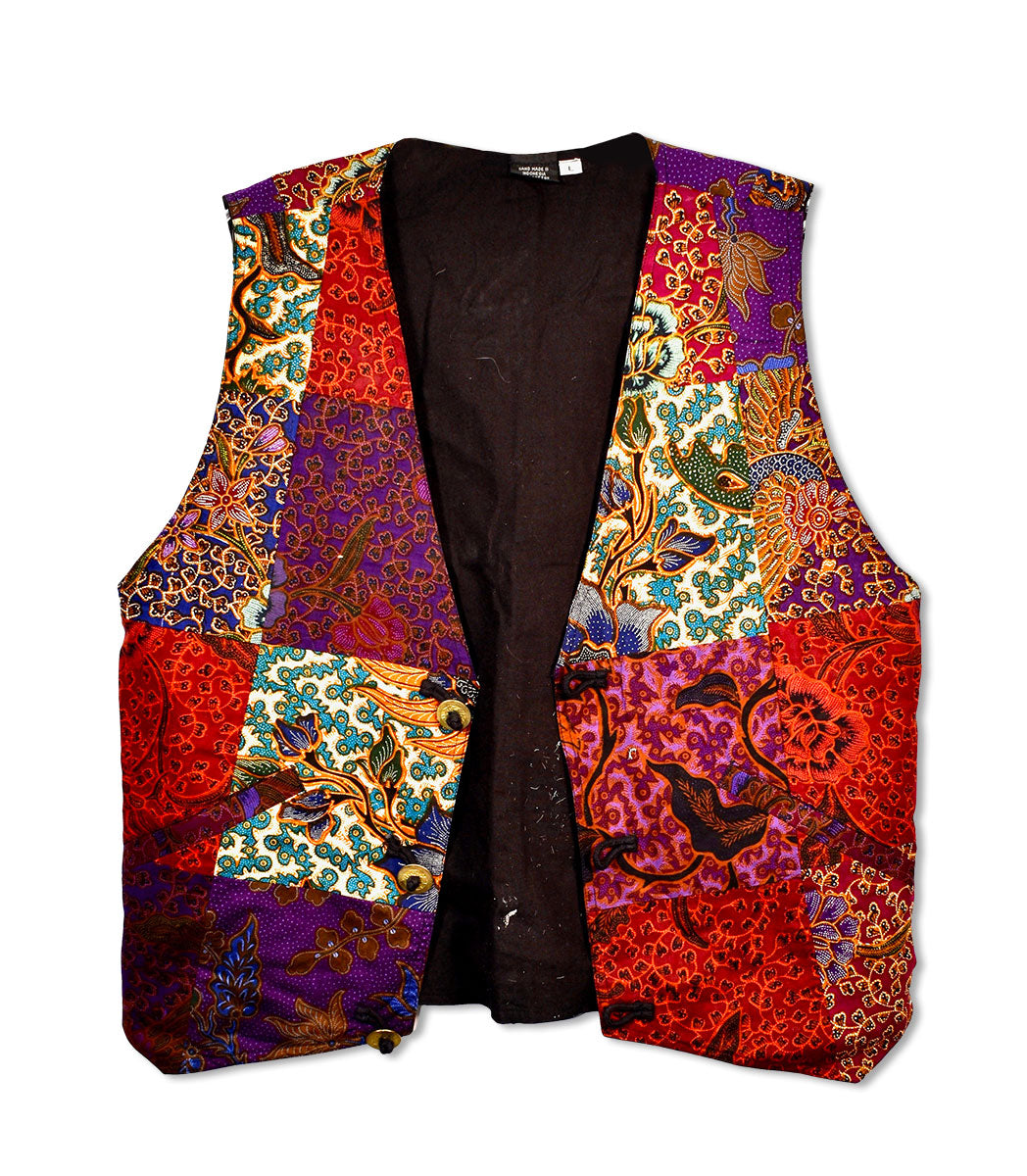 Multi-color, patchwork three-button waistcoat worn by Rick Allen. The design features flowers and branches, and three gold-plated steel buttons. From the Rick Allen collection.
