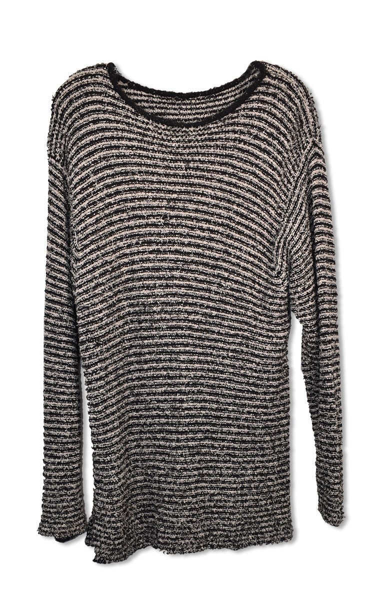 Unbranded gray and black striped long sleeve sweatshirt featuring coarse tiny frayed-like material. From the Joe Elliott collection.