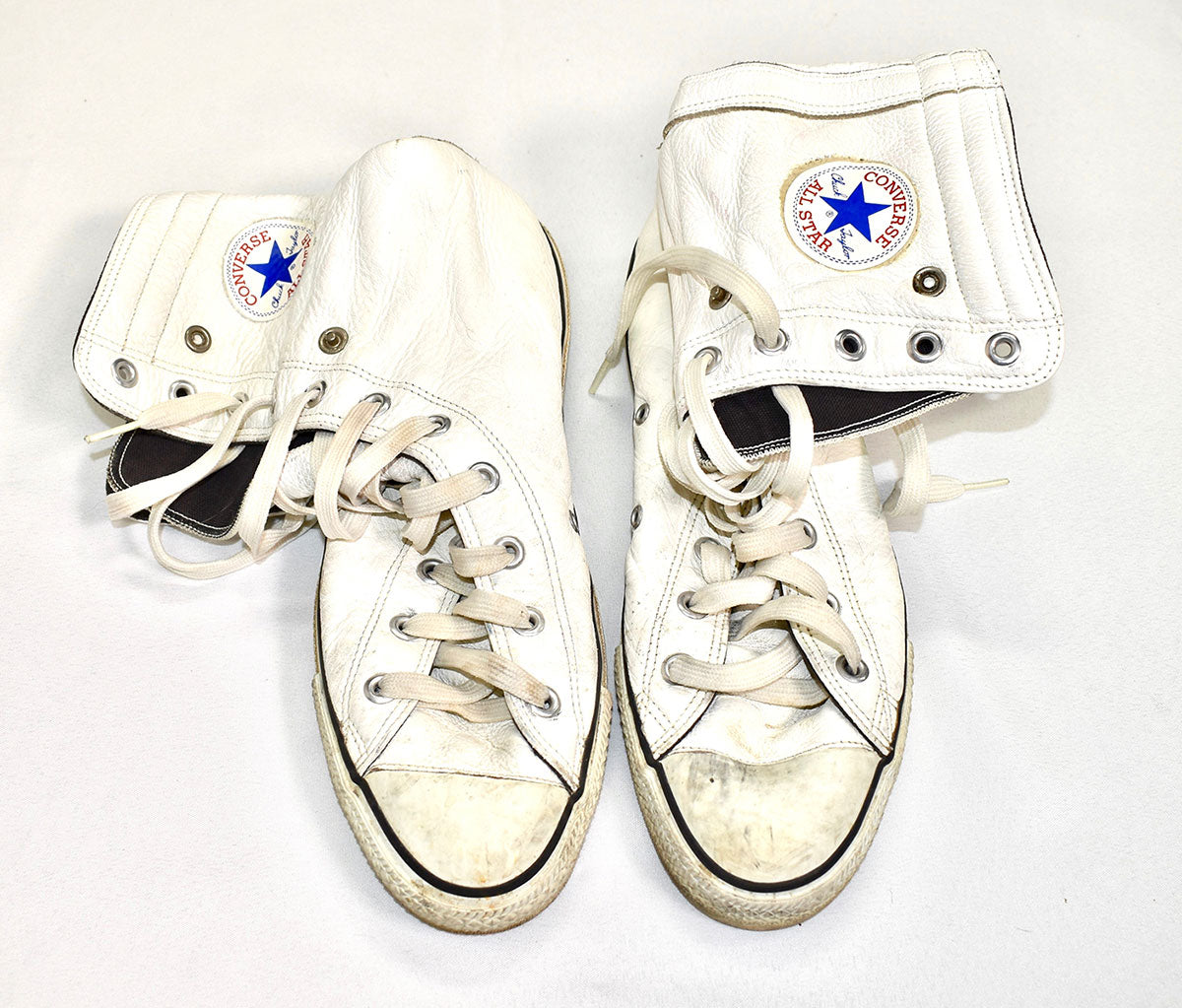 Rick Allen's worn, white leather high top Chucks. From the collection of Rick Allen.