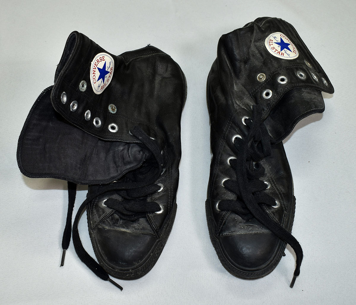 Rick Allen's black leather high top Chucks. These Converse All Stars have signs of wear, but are still in good condition for rocking. From the collection of Rick Allen.