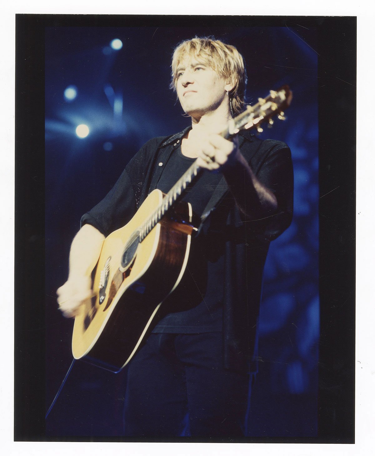 Joe Elliott strums his acoustic-electric guitar during the Euphoria tour in this 8x10 colour portrait, circa 2000. The picture was housed in an envelope labeled "D. Leppard. B/w with prints," along with post-it note that reads "For Dave Wolff (see Viv)." From the collection of Def Leppard.