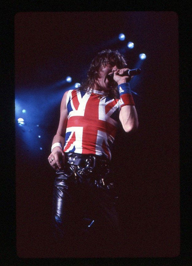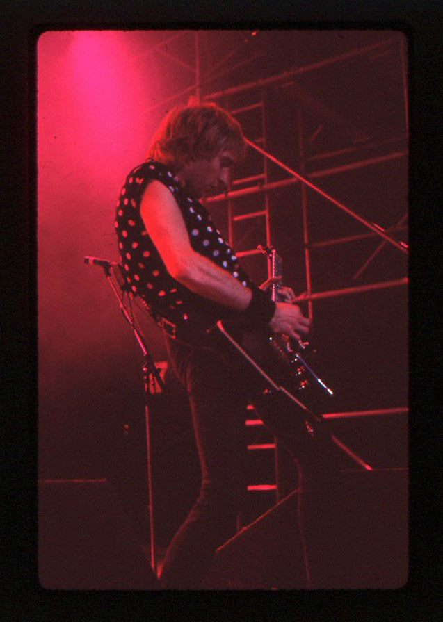 Encore! Encore! Steve Clark favored an end-of-show costume change to something a bit more wild, and the fans absolutely fed on it. In this live shot from the Hysteria Tour San Francisco in November of 1987 Steve plays his Back Beauty Gibson Guitar, and sports the Union Jack proudly draped over his shoulders, with black aviator sunglasses. Courtesy of the Lorelei Shellist Private Collection.
