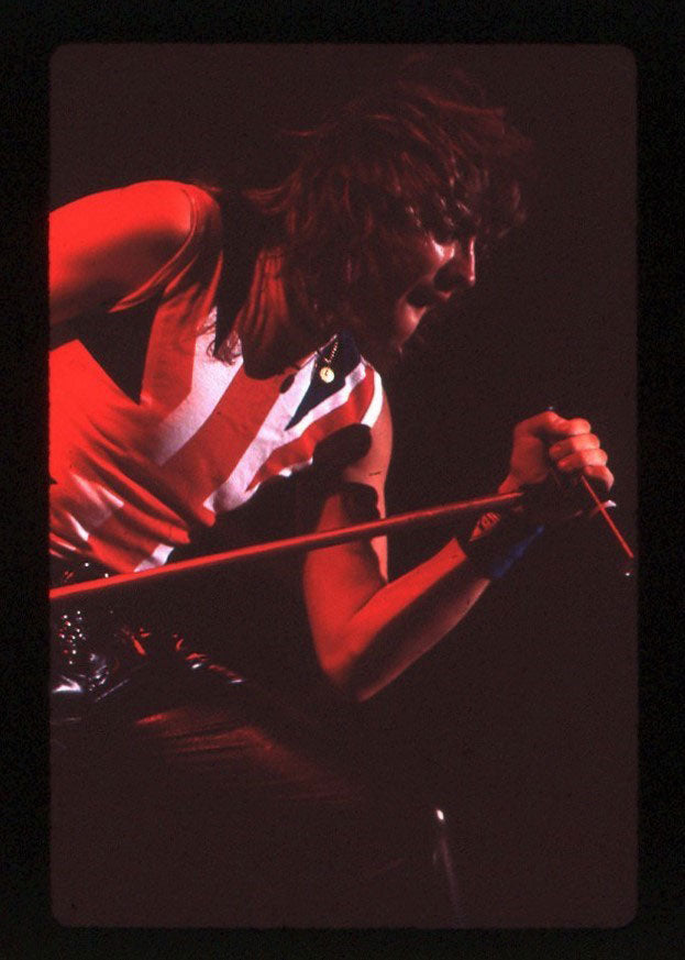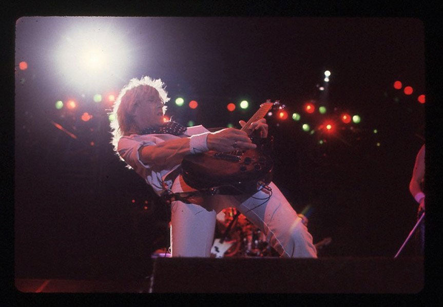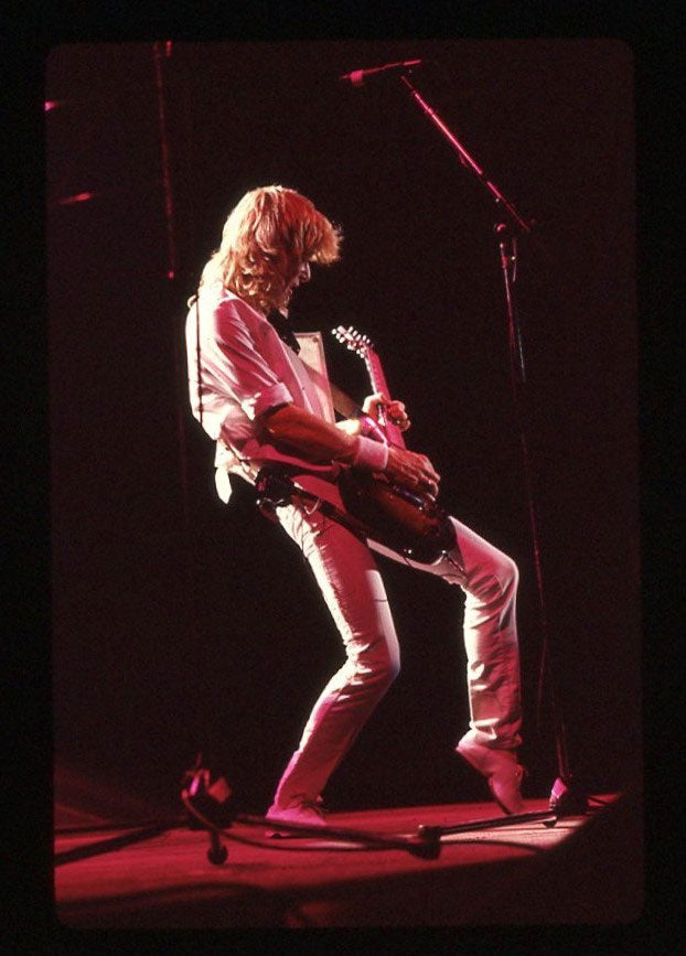 International rock-starring it at the Pacific Coliseum in Vancouver, 23 June 1988! Steve Clark is working up a sweat over his Gibson EDS-1275 Twin Neck, also known as the coolest guitar in rock. No shirt, but sporting a scarf, and a jacket made for him by Lorelei Shellist that features flags from around the globe. Courtesy of the Lorelei Shellist Private Collection.