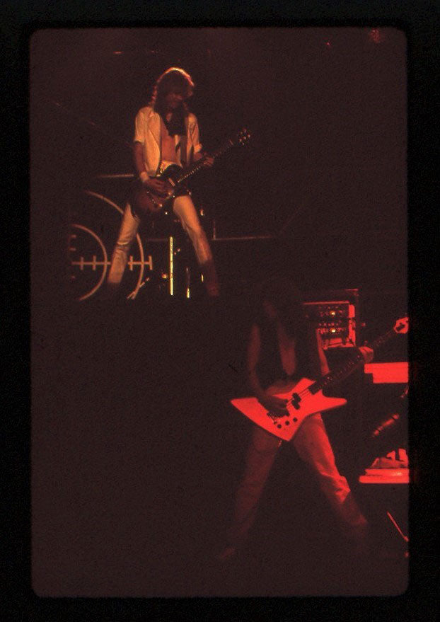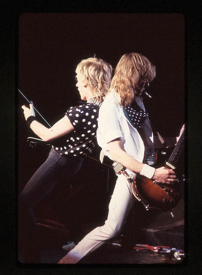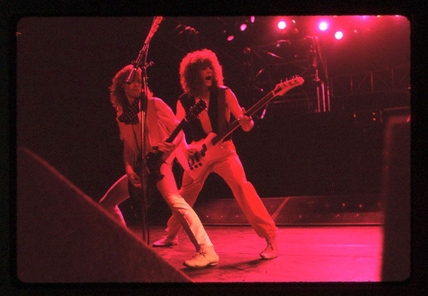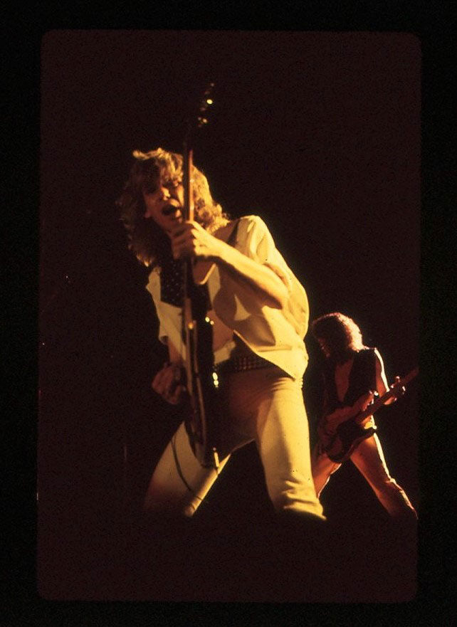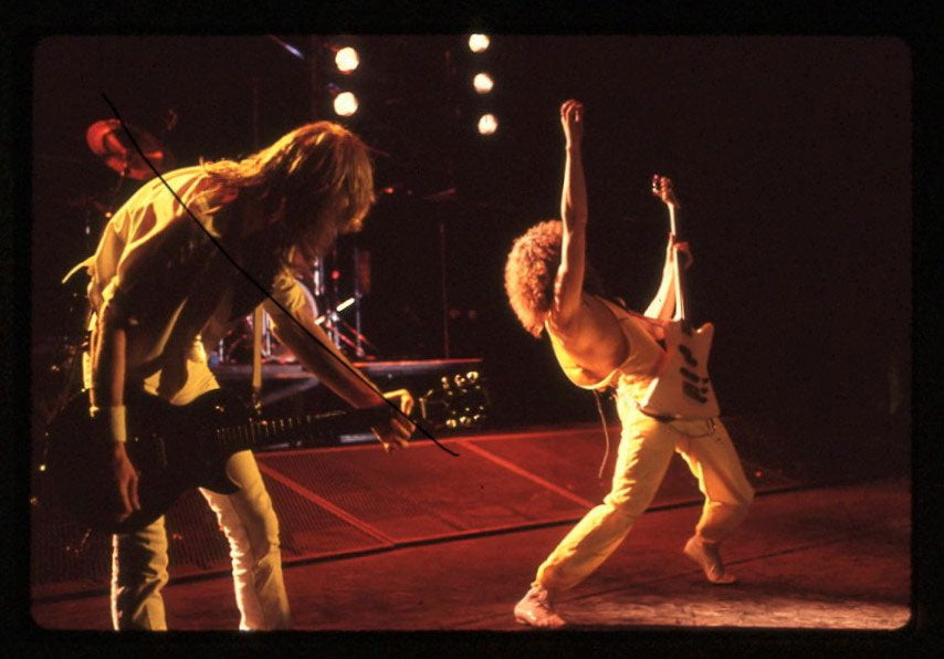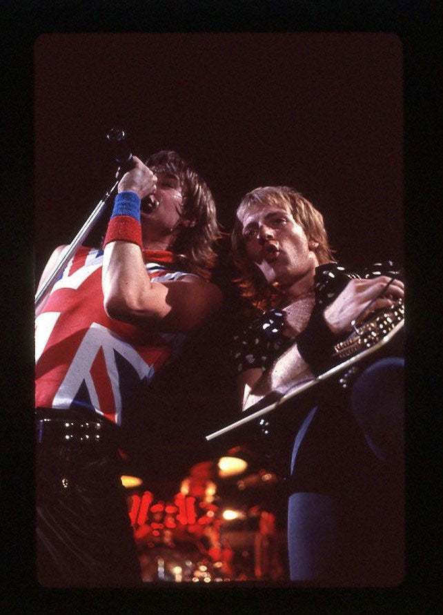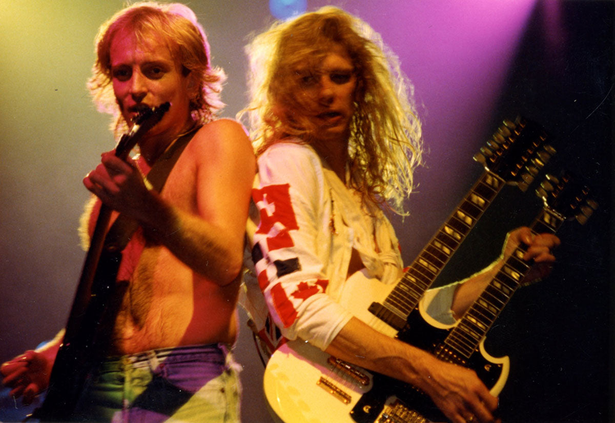 A blazing moment captured - Phil Collen rocking back-to-back with Steve Clark at the Pacific Coliseum in Vancouver, 23rd June 1988. It was the final night of the Hysteria tour Canada, and Jon Bon Jovi appeared as the special guest for the encore song "Travelin' Band." Steve is playing "the coolest guitar in rock" - the Gibson EDS-1275 Twin Neck, made famous by Jimmy Page. Who needs the Gods of War when you've got two Gods of Rock? Courtesy of the Lorelei Shellist Private Collection.