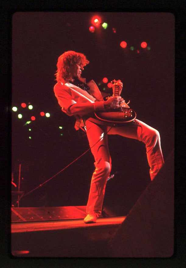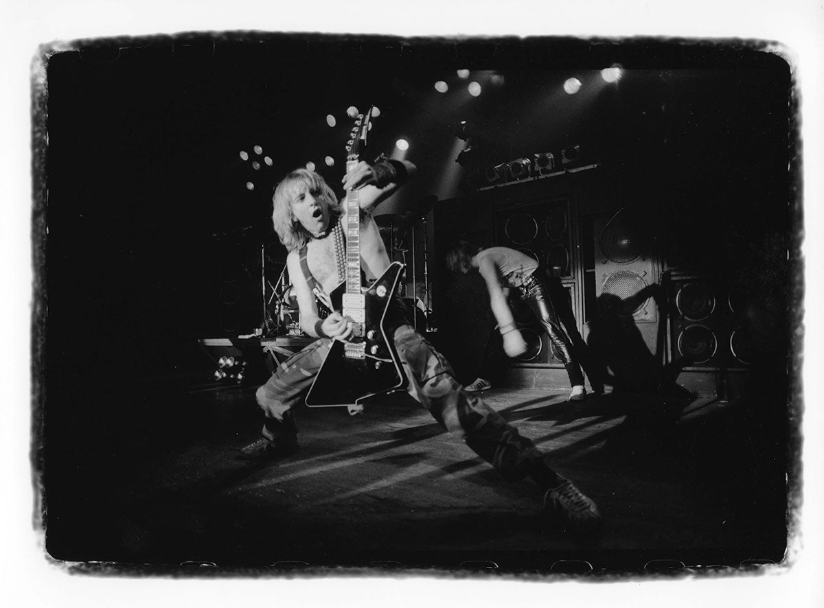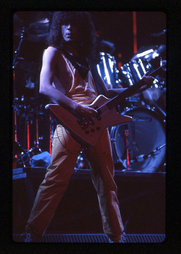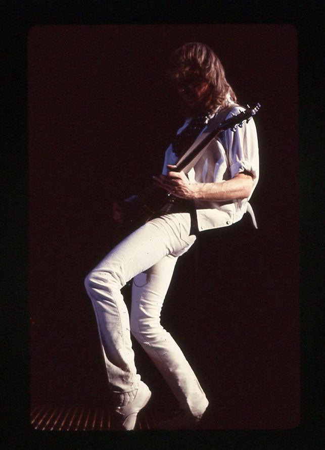 Steve Clark's Gibson Firebird is about to take flight in this live shot taken at Vancouver's Pacific Coliseum, 23 June, 1988, Hysteria Tour. Special guest Bon Jovi would appear for the encore that night. Steve's jacket (made by Lorelei Shellist) features international flags, with the Swiss, Dominican Republic, and Canadian flags on the right arm, and the Union Jack on the pocket. Photo print is in good condition. Courtesy of the Lorelei Shellist Private Collection.