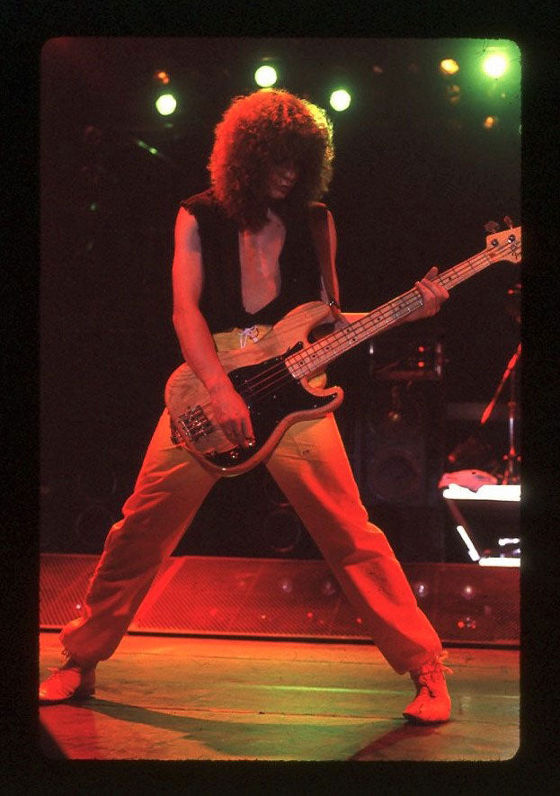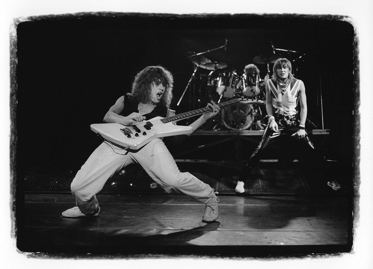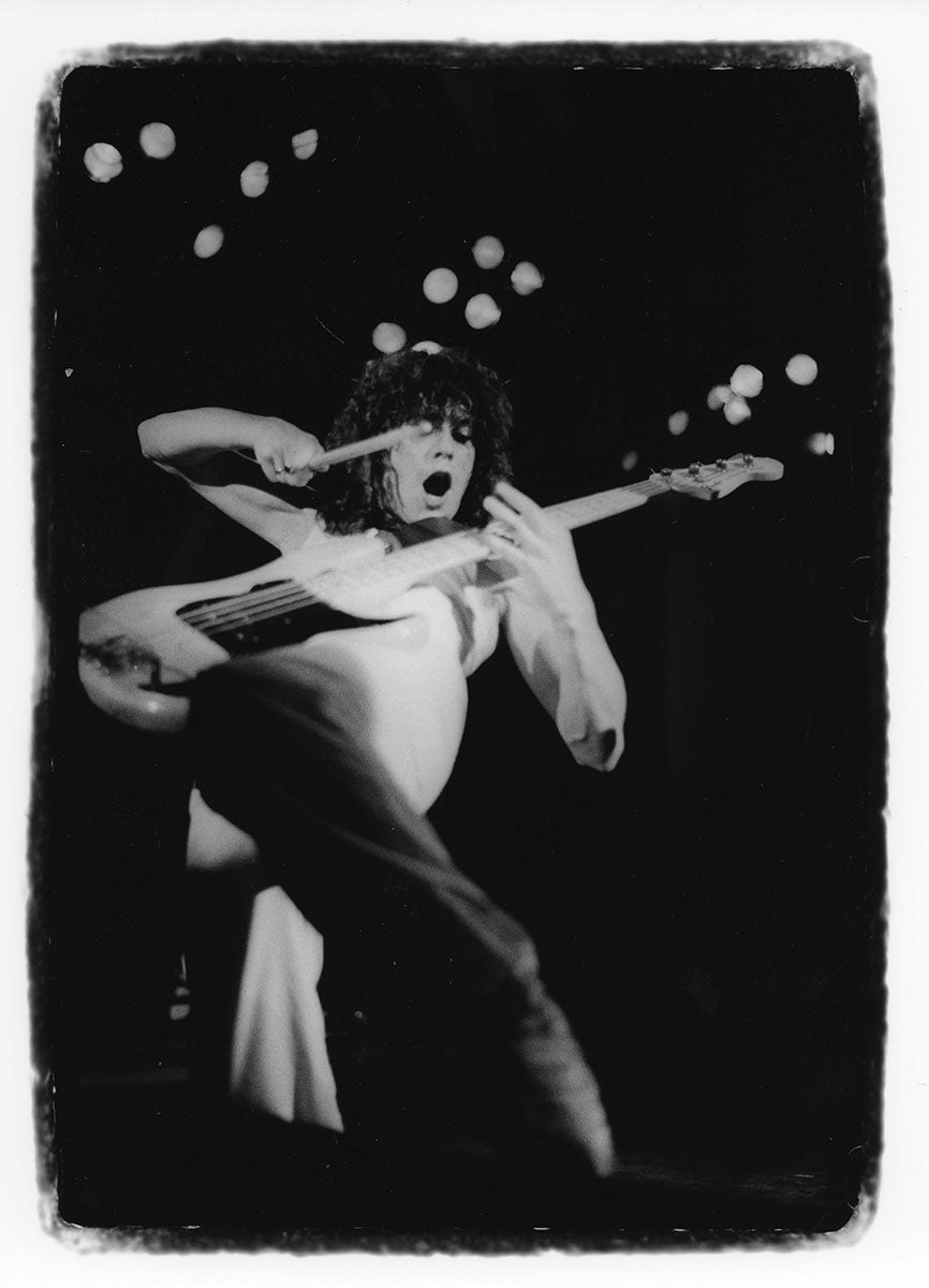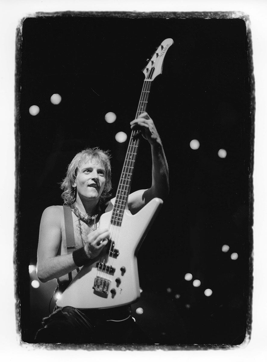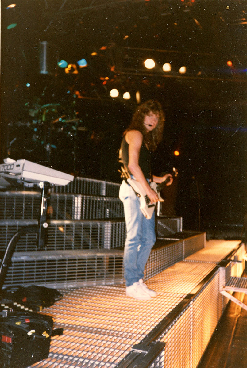 Rick Savage tunes up before another mind-bending Hysteria Tour performance in this rare behind-the-scenes sound check snap. The band really got their steps in at these shows, playing upstairs, downstairs, at all different angles, ensuring that everyone was delivered mad rock 'n roll all around. Rick Allen reminisces about the experience of riding those Hysteria risers up into the air with Sav: "It was pretty unique you know, having four front rows. The scariest part of the show for me was the whole riser during the middle section of Rocket would start to go up into the air. Probably up to about you know, probably about 30 feet above the deck. You know, Sav was standing behind me, looking out. And I'm standing or sitting you know, looking into my kit. So I'm looking one way, he's looking the other. And as the, as the riser went higher and higher and higher, Sav would start to push into me. So it was like at certain times, it got really quite challenging to play, because he was, he was obviously a little afraid of heights, you know? And like I say as we got, as we got further up in the air, he would push further in. And I didn't want to push back on him because you know, I mean it, it would have been disaster, disastrous if he had fallen off." 4x6 color print. Courtesy of the Lorelei Shellist Private Collection.