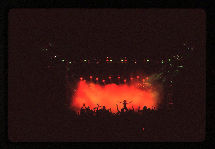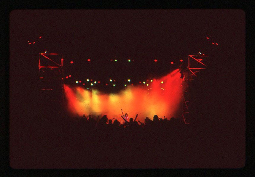 The crowd filing in and preparing for an electric night on the Hysteria Tour, 1987-88. This photograph taken from the box section, lights on, gives an excellent perspective of the tour's "in-the-round" set up. Color photo print. Courtesy of the Lorelei Shellist Private Collection.