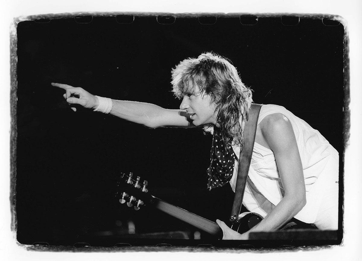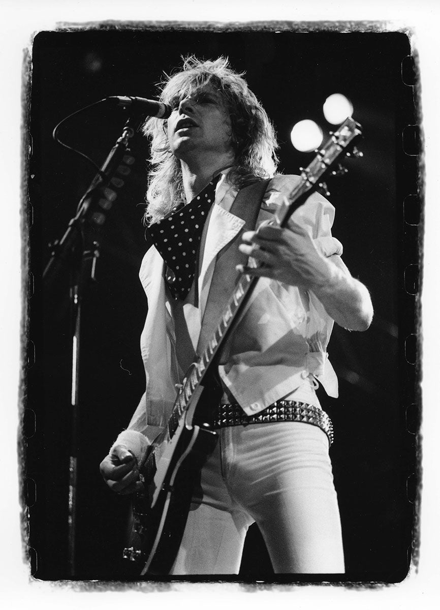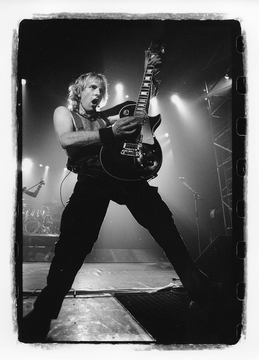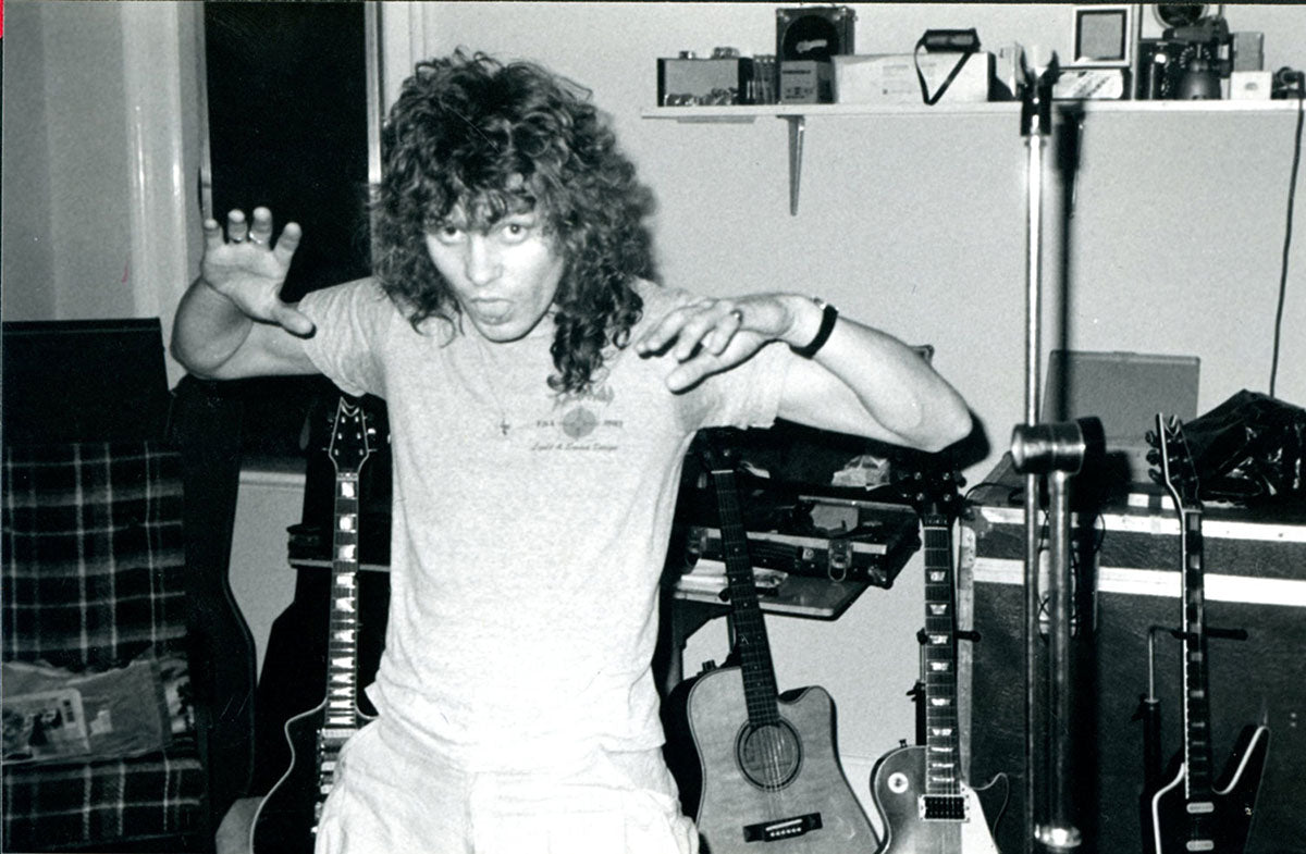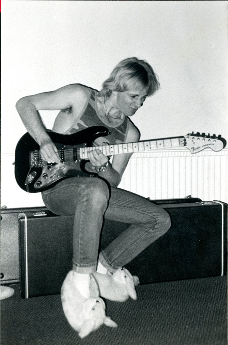 Bunny-slippered Phil Collen sits atop a guitar case playing his beloved 1978 Fender Stratocaster "Felix." He's in the Booterstown Band House in Dublin where Def Leppard began work on Hysteria in 1984. Felix helped define the sound of Hysteria, and Phil used it on more records than any other guitar he owns. He describes Felix as "kind of a road warrior... It would stay in tune, it reacted, it would respond. You'd turn it down it would go clean. It would just have these amazing different tones in it and others thing. So that was the thing. It was just very versatile as well." Here's more from Phil on his relationship with this very special guitar: "Well, it had a kind of a sound that you could do everything on. You know, all the Hysteria stuff like - it just had a clean Fender Strat sound. You could get it to sound like Jimi Hendrix. Or because it had a humbucker, you know, you could do all the other stuff, like you know ... Animal, you know, ... It was a really even guitar. And the intonation. That's such an important thing, you know? Especially when you're recording with Mutt. Mutt Lange. He's always saying, you know, we're going to do overdubs, so everything has to be in tune. Otherwise it just starts to get really wonky and, and, tuning wise ... So this guitar was - the intonation was perfect on it. And it's kind of rare that a guitar does that. Just kind of the whole all-around thing. I actually used it recently. It was in Joe's demos and stuff, and I, and I used it and sounds really cool. Still... Well, I have to drop a name here. So I met Eddie Van Halen, when I was rehearsing with Girl. And uh, I was playing this and Ritchie Blackmore's strap had three single coil pickups. These are actually humbuckers. They look like single coils but they're actually really humbuckers. I was saying, yeah I've got this Strat and he said, you're never going to be happy with it until you put a humbucker right there now. And I thought, well if Eddie Van Halen is telling me I should put a humbucker on my Strat, I should do that. So I did and, and then that was the sound. That was the sound I actually had in my head. And, immediately it was just like, cool. Because you had the whammy bar. You could do all this crazy stuff on that. But you also had this Humbucker and that just made all the difference. You could fly over the sun. Single coils, when you turn up that much gain on an amplifier, you really struggle with it. They howl, they don't like it. And they buzz. But with a Humbucker, it just smooths it all out, and it's just sounds raw and big and, and monstrous, you know." Black and white photo. Courtesy of the Lorelei Shellist Private Collection.