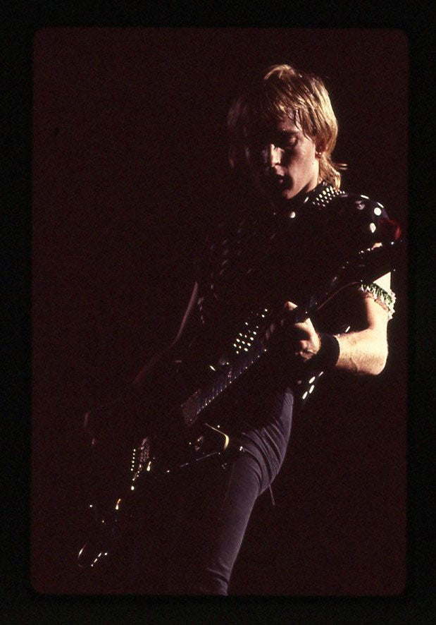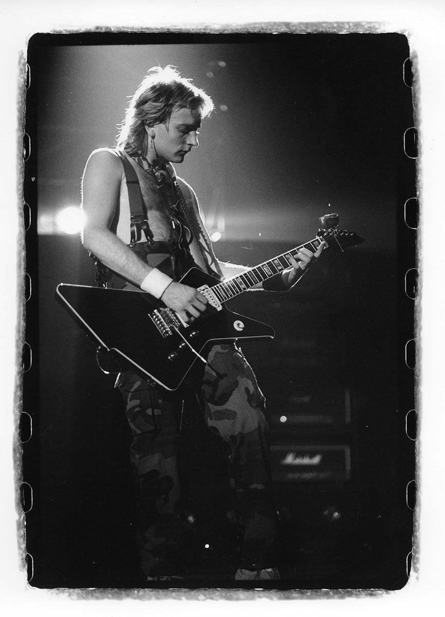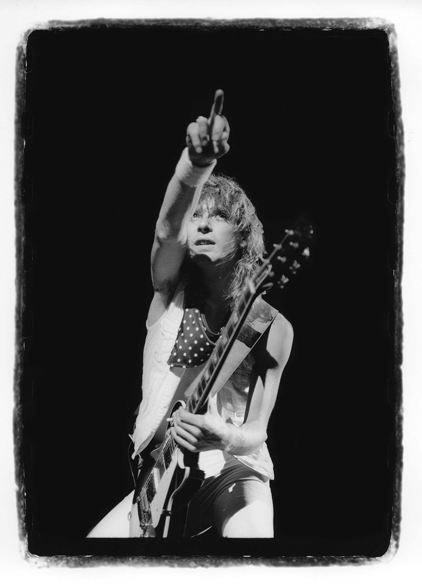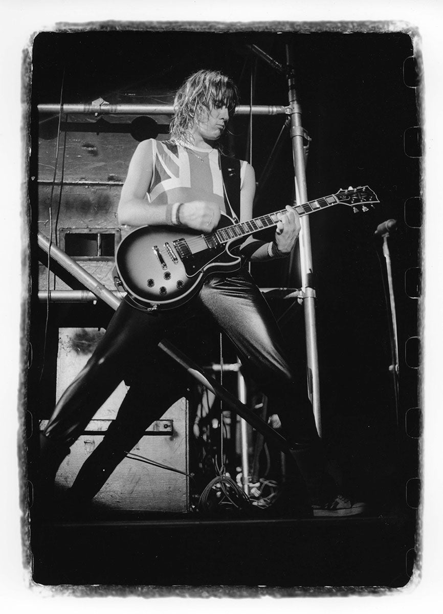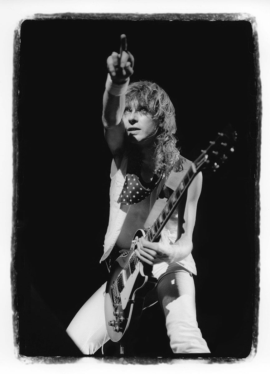 Bunny-slippered Phil Collen sits atop a guitar case playing his beloved 1978 Fender Stratocaster "Felix." He's in the Booterstown Band House in Dublin where Def Leppard began work on Hysteria in 1984. Felix helped define the sound of Hysteria, and Phil used it on more records than any other guitar he owns. He describes Felix as "kind of a road warrior... It would stay in tune, it reacted, it would respond. You'd turn it down it would go clean. It would just have these amazing different tones in it and others thing. So that was the thing. It was just very versatile as well." Here's more from Phil on his relationship with this very special guitar: "Well, it had a kind of a sound that you could do everything on. You know, all the Hysteria stuff like - it just had a clean Fender Strat sound. You could get it to sound like Jimi Hendrix. Or because it had a humbucker, you know, you could do all the other stuff, like you know ... Animal, you know, ... It was a really even guitar. And the intonation. That's such an important thing, you know? Especially when you're recording with Mutt. Mutt Lange. He's always saying, you know, we're going to do overdubs, so everything has to be in tune. Otherwise it just starts to get really wonky and, and, tuning wise ... So this guitar was - the intonation was perfect on it. And it's kind of rare that a guitar does that. Just kind of the whole all-around thing. I actually used it recently. It was in Joe's demos and stuff, and I, and I used it and sounds really cool. Still... Well, I have to drop a name here. So I met Eddie Van Halen, when I was rehearsing with Girl. And uh, I was playing this and Ritchie Blackmore's strap had three single coil pickups. These are actually humbuckers. They look like single coils but they're actually really humbuckers. I was saying, yeah I've got this Strat and he said, you're never going to be happy with it until you put a humbucker right there now. And I thought, well if Eddie Van Halen is telling me I should put a humbucker on my Strat, I should do that. So I did and, and then that was the sound. That was the sound I actually had in my head. And, immediately it was just like, cool. Because you had the whammy bar. You could do all this crazy stuff on that. But you also had this Humbucker and that just made all the difference. You could fly over the sun. Single coils, when you turn up that much gain on an amplifier, you really struggle with it. They howl, they don't like it. And they buzz. But with a Humbucker, it just smooths it all out, and it's just sounds raw and big and, and monstrous, you know." Black and white photo. Courtesy of the Lorelei Shellist Private Collection.