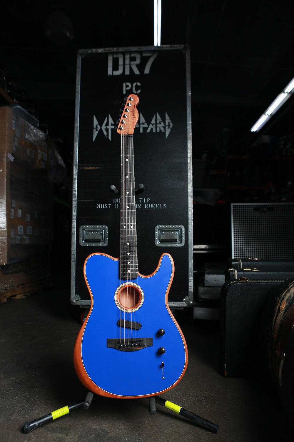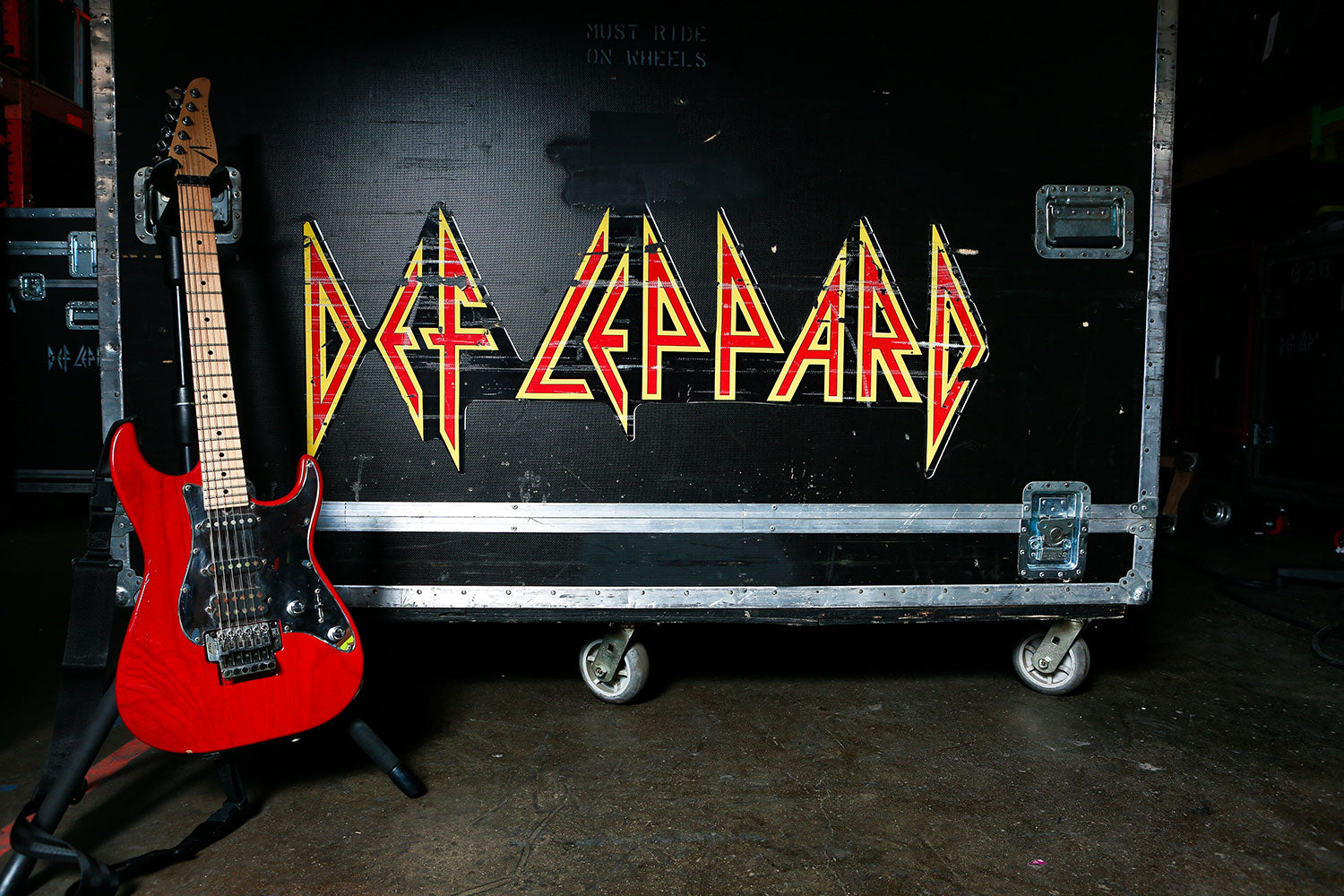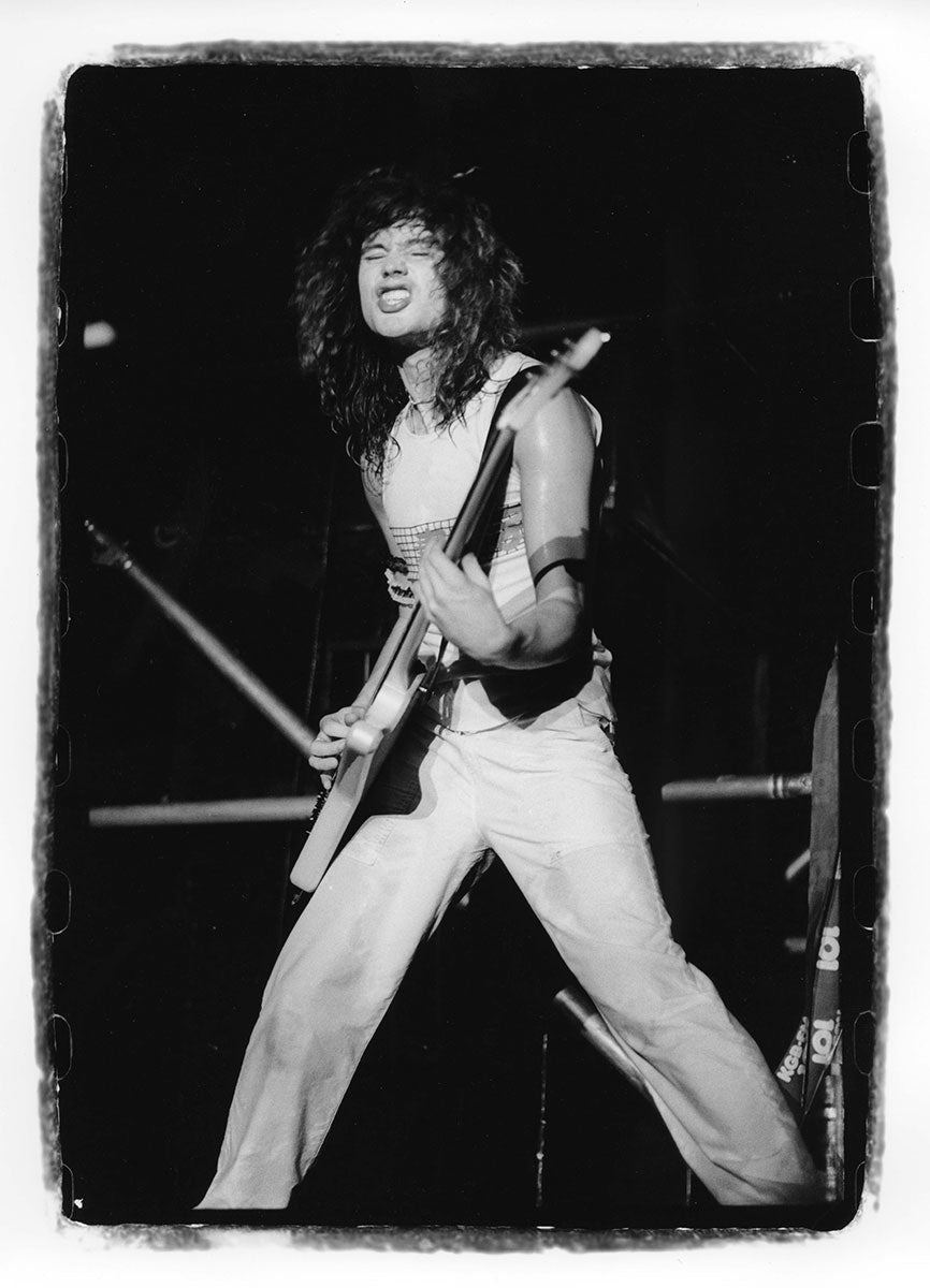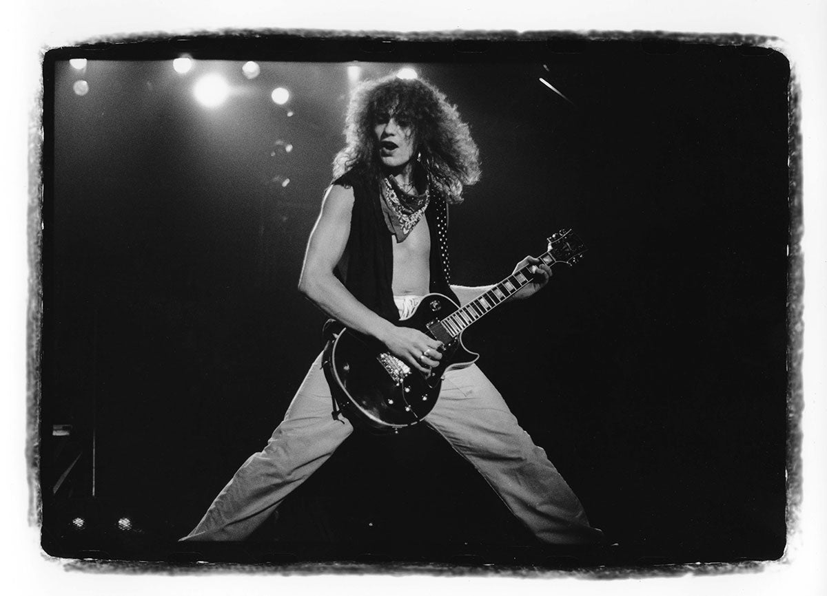 Bunny-slippered Phil Collen sits atop a guitar case playing his beloved 1978 Fender Stratocaster "Felix." He's in the Booterstown Band House in Dublin where Def Leppard began work on Hysteria in 1984. Felix helped define the sound of Hysteria, and Phil used it on more records than any other guitar he owns. He describes Felix as "kind of a road warrior... It would stay in tune, it reacted, it would respond. You'd turn it down it would go clean. It would just have these amazing different tones in it and others thing. So that was the thing. It was just very versatile as well." Here's more from Phil on his relationship with this very special guitar: "Well, it had a kind of a sound that you could do everything on. You know, all the Hysteria stuff like - it just had a clean Fender Strat sound. You could get it to sound like Jimi Hendrix. Or because it had a humbucker, you know, you could do all the other stuff, like you know ... Animal, you know, ... It was a really even guitar. And the intonation. That's such an important thing, you know? Especially when you're recording with Mutt. Mutt Lange. He's always saying, you know, we're going to do overdubs, so everything has to be in tune. Otherwise it just starts to get really wonky and, and, tuning wise ... So this guitar was - the intonation was perfect on it. And it's kind of rare that a guitar does that. Just kind of the whole all-around thing. I actually used it recently. It was in Joe's demos and stuff, and I, and I used it and sounds really cool. Still... Well, I have to drop a name here. So I met Eddie Van Halen, when I was rehearsing with Girl. And uh, I was playing this and Ritchie Blackmore's strap had three single coil pickups. These are actually humbuckers. They look like single coils but they're actually really humbuckers. I was saying, yeah I've got this Strat and he said, you're never going to be happy with it until you put a humbucker right there now. And I thought, well if Eddie Van Halen is telling me I should put a humbucker on my Strat, I should do that. So I did and, and then that was the sound. That was the sound I actually had in my head. And, immediately it was just like, cool. Because you had the whammy bar. You could do all this crazy stuff on that. But you also had this Humbucker and that just made all the difference. You could fly over the sun. Single coils, when you turn up that much gain on an amplifier, you really struggle with it. They howl, they don't like it. And they buzz. But with a Humbucker, it just smooths it all out, and it's just sounds raw and big and, and monstrous, you know." Black and white photo. Courtesy of the Lorelei Shellist Private Collection.