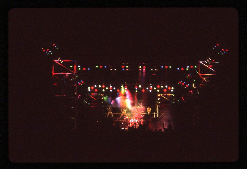 The band, crew, and audience ring in 1988’s New Year's Rocking Eve at the sold-out University of South Florida Sun Dome in Tampa. What New Year's party would be complete without the Baby New Year? In this case, we get two - a baby for each "8." Fun fact via Phil - one of those mighty diapers (on the left) belongs to Production Manager of legend, Charlie Hernandez. The person walking back with the red cup is Troy Luccketta from Tesla. This show would later become infamous for an on-stage raid by the "Fun Police," a gathering of the band's girlfriends and Rick Allen's mom. Ah, a mother's work is never done. Color photo courtesy of the Lorelei Shellist Private Collection.