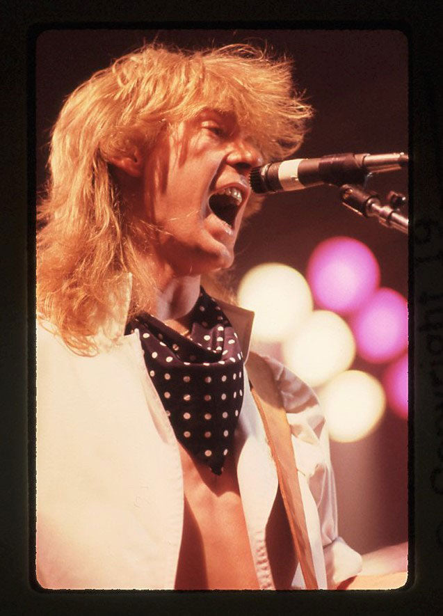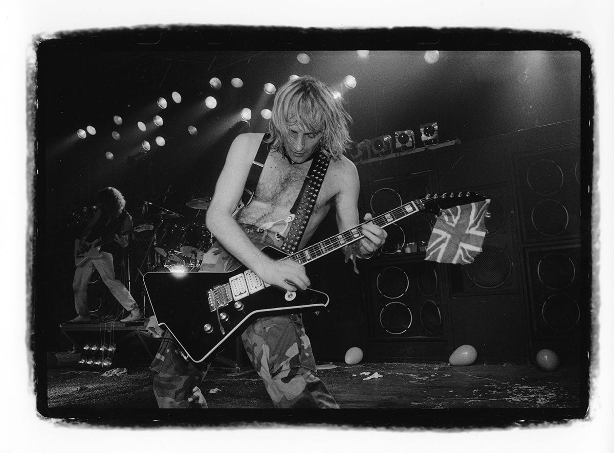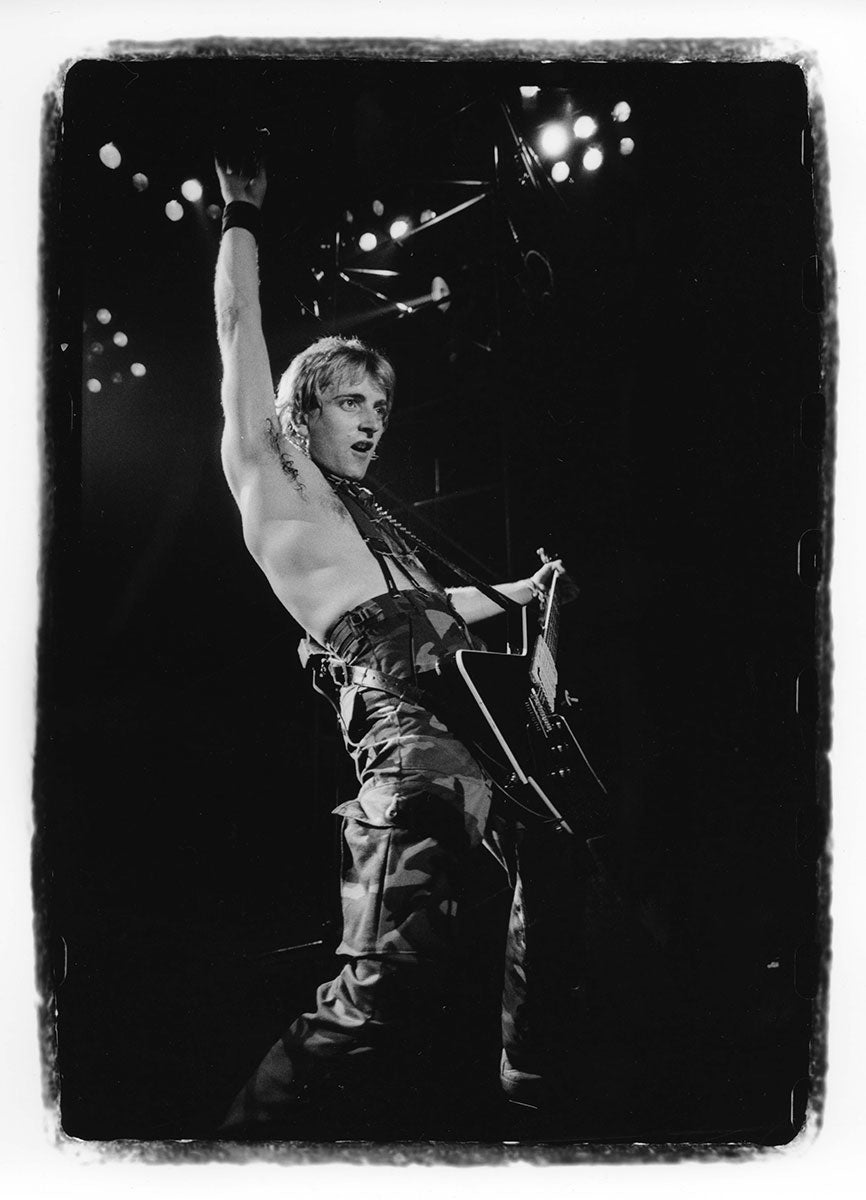 This sizzling capture of the Hysteria Tour features Joe Elliott, Phil Collen, Rick Savage, and Steve Clark all lined up, shirtless, sweating, and delivering their all to a fully amped audience. Rick Allen rocks the crowd on the opposite side of the stage. Don't worry - even in the round, there's enough Def Leppard for everyone. Says Rick: "I mean I think I had the best seat in the house. Um, plus the, the whole thing would rotate. So and then the interesting thing was I had a, I had a picture of a giant picture of my own face on, on, on my back." Courtesy of the Lorelei Shellist Private Collection.