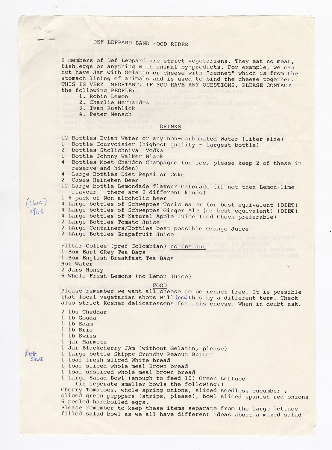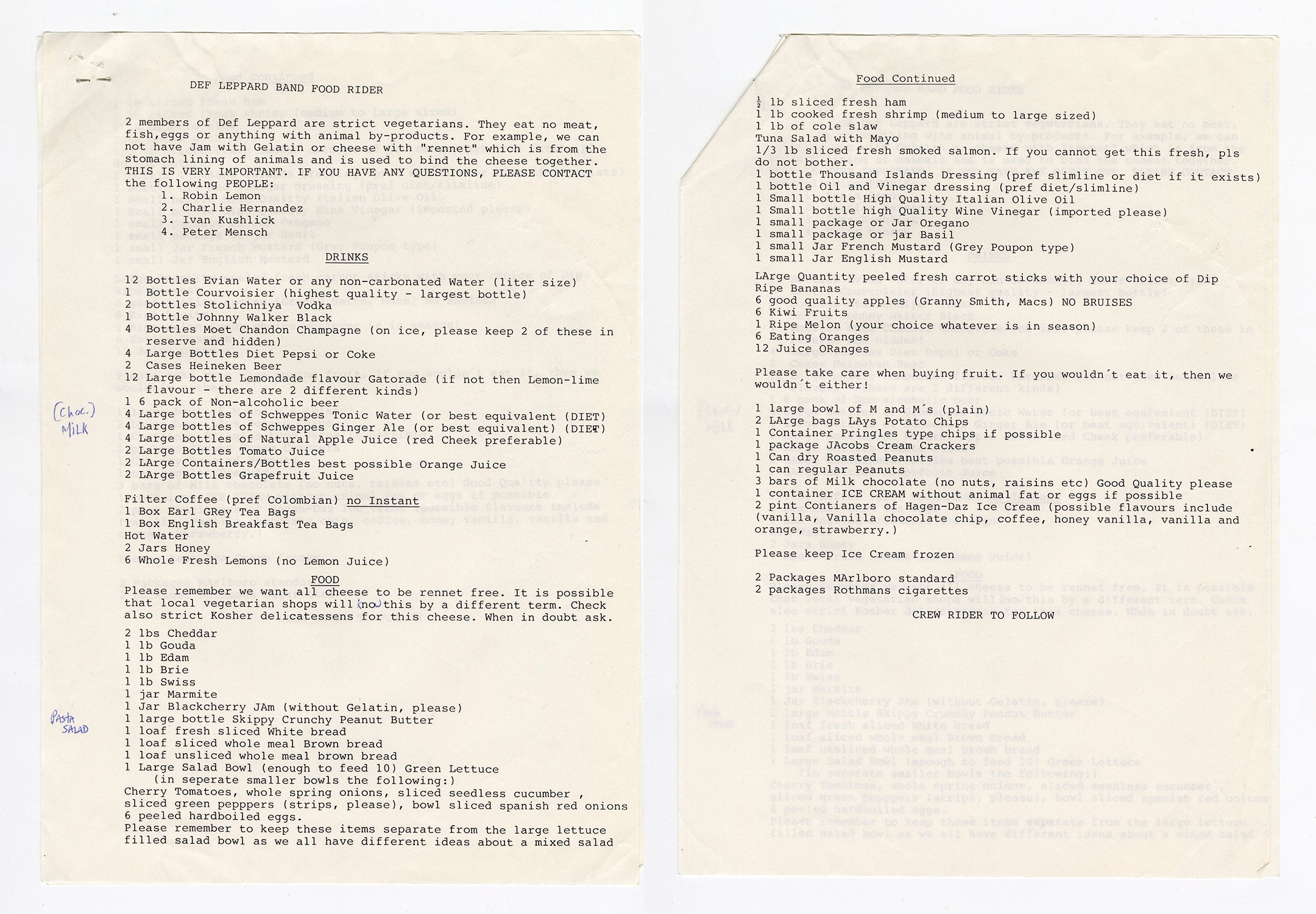 "We are the hungry ones on a lightning raid," and evidently also on a band food rider. This list of backstage requests details the makings of Leppard fare like: ingredients to an excellent salad bar, a vegetarian-friendly, rennet-free cheese plate, fruit selection, some assorted sweets for quick energy boosts, and of course, liquids like tea with lemon and honey for the voice, vodka, whiskey, champagne, and mixers. A handwritten note adding pasta salad and chocolate milk makes the feast complete. Another important highlight is that "2 members of Def Leppard are strict vegetarians," further emphasized by an emboldened, "THIS IS VERY IMPORTANT." The band's care for ethical foods and each other shows through in every detail. From the collection of Def Leppard.