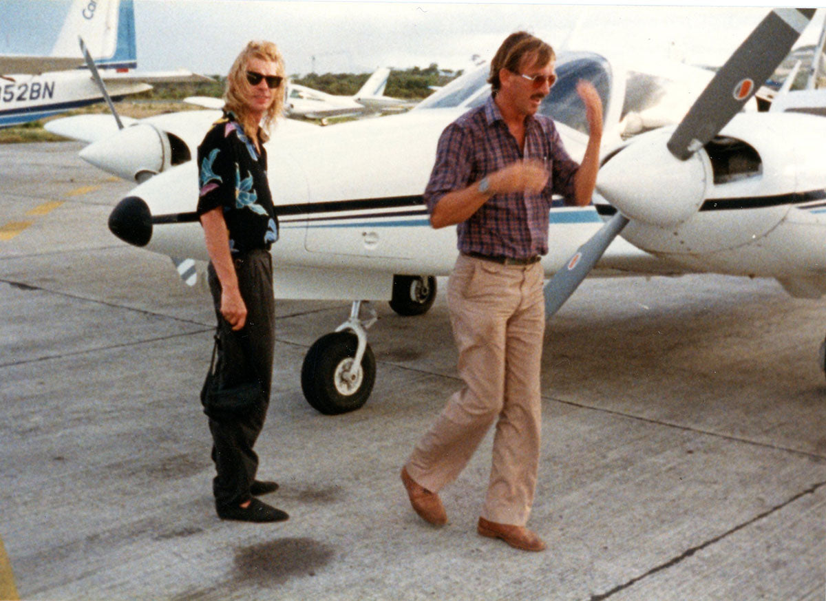 Adventures! Steve Clark on holiday in Antigua, preparing for a propeller plane ride in his favorite island-themed shirt, 1987. Courtesy of the Lorelei Shellist Private Collection.