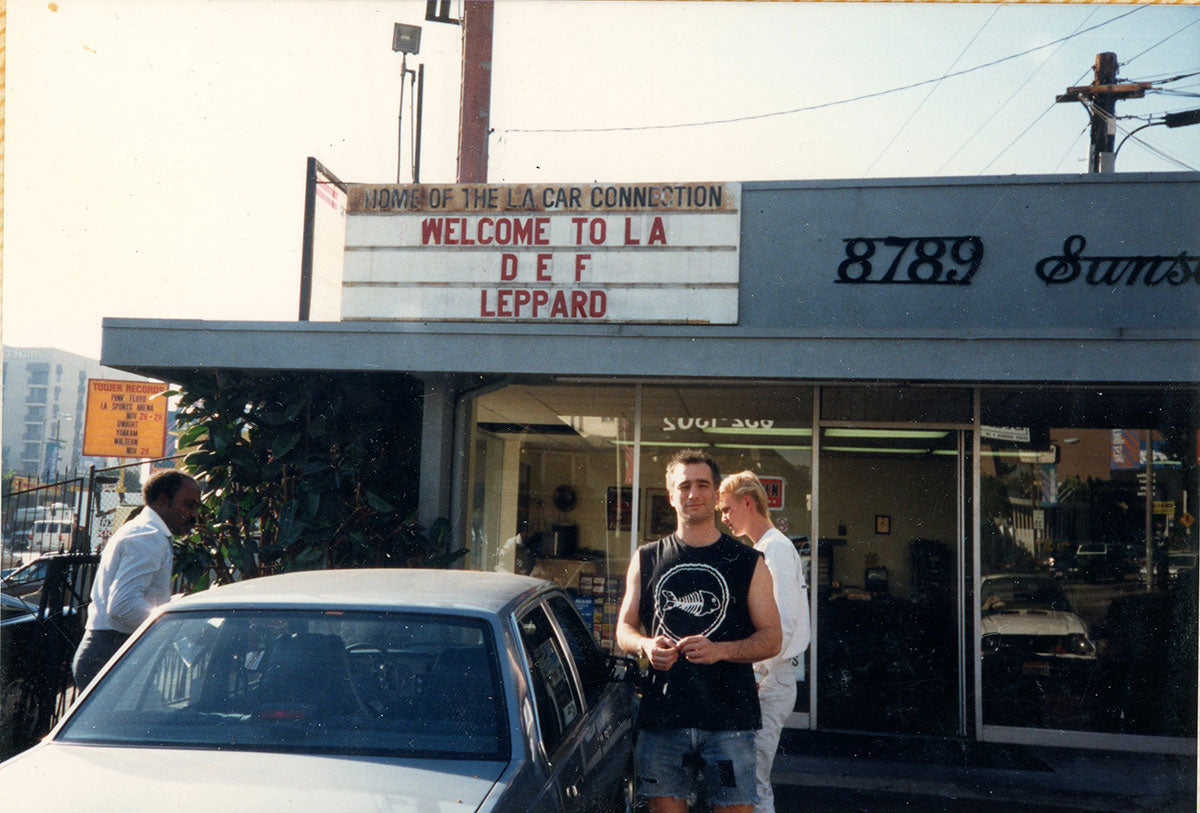 Def Leppard Manager Peter Mensch from Q-Prime (wearing a Fishbone t-shirt,) stands in front of Sunset Rent-A-Car next to Tower Records on Sunset Blvd, Hollywood. The marquee welcomes the band back to Los Angeles for their 22nd November 1987 Hysteria Tour performance at the LA Memorial Sports Arena. Courtesy of the Lorelei Shellist Private Collection.