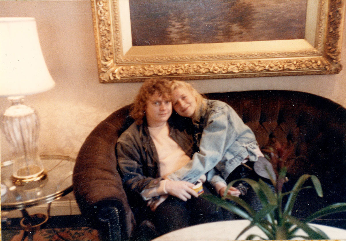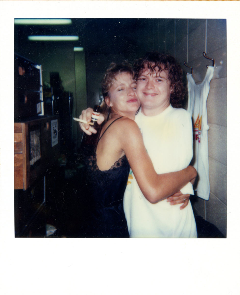 Rick Allen enjoys a backstage squeeze from then-squeeze Miriam Barendsen, on the Hysteria Tour, 1987-88. Courtesy of the Lorelei Shellist Private Collection.