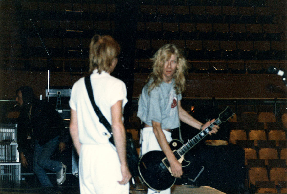 Steve Clark grabs a quick chat with Phil Collen in this rare behind-the-scenes sound check photo during the Hysteria Tour, circa 1987-88. The guy in the background is sound man Phil "Side Phil" Wilkey. The boys are getting ready to make those guitars sing, and the folks about to fill that amphitheater have no idea what's going to hit them. Courtesy of the Lorelei Shellist Private Collection.