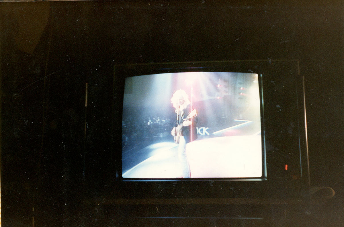 Steve Clark as seen through a monitor, playing at the Sanremo Music Festival at the Teatro Ariston di Sanremo, February 1988. Clark, Collen, and Savage would later guest alongside Ben E. King at the festival, accompanying him in a blazing rendition of the classic hit "Stand By Me." Color 4x6 photo. Courtesy of the Lorelei Shellist Private Collection.