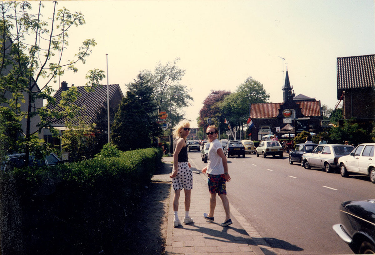 Steve Clark and Phil Collen walking down a sunny street in Oud-Loosdrecht Village in the Netherlands, sporting sunglasses, colorful shorts, and springs in their steps. In 1984 when this photo print was shot, the Leppards were staying at the Princess Inn in Loosdrecht whilst recording Hysteria in nearby Hilversum Holland at Wisseloord Studios. Courtesy of the Lorelei Shellist Private Collection.