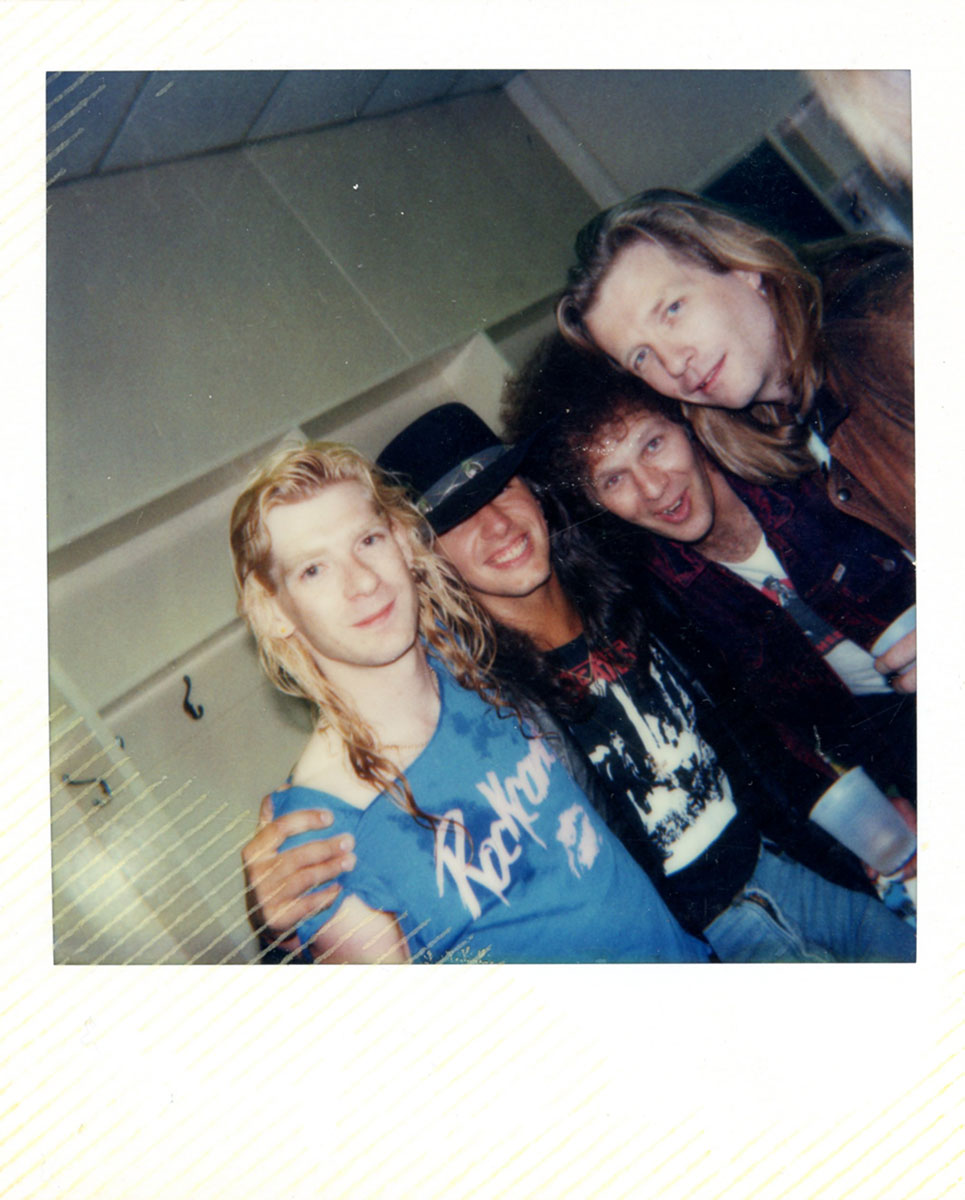 Steve Clark arm in arm with members of Bon Jovi - Richie Sambora, Paul Dean of Loverboy and Bob Rock at the Pacific Coliseum in Vancouver Canada, Hysteria Tour, 23 June, 1988. This was the final night of the Canadian leg of the tour, and to polish it off, Jon Bon Jovi performed as the special guest for the band's encore song "Travelin' Band." Courtesy of the Lorelei Shellist Private Collection.