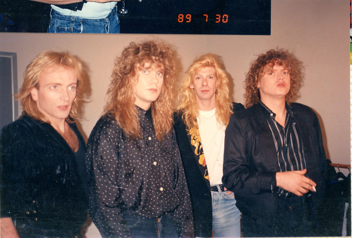 Phil Collen, Rick Savage, Steve Clark, and Rick Allen, put together and camera-ready sometime around Feb 1988, Hysteria Tour. 6x4 color print. Courtesy of the Lorelei Shellist Private Collection.