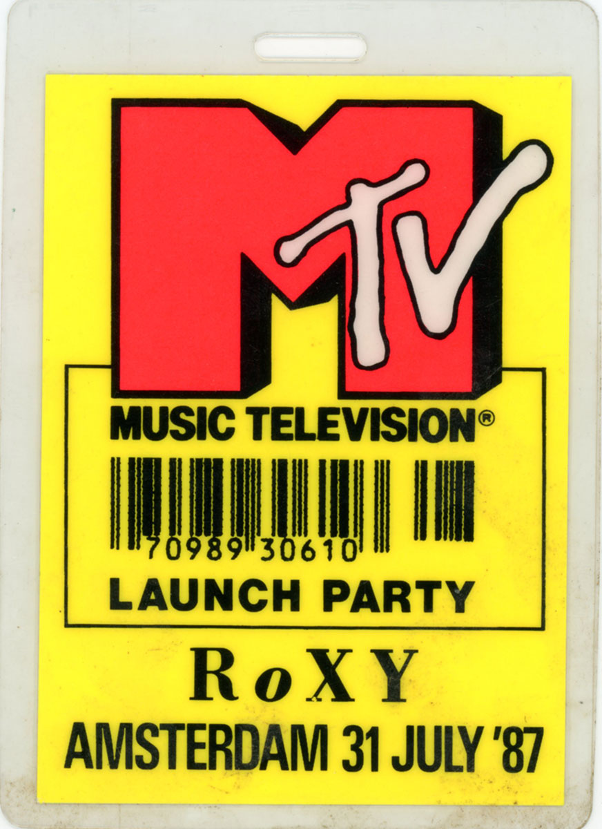 I want my MTV all-access pass! Steve Clark's yellow laminate pass to MTV Europe's launch party. The channel officially began airing live on August 1st, so the release party at the Roxy in Amsterdam rocked well past midnight July 31, 1987. Elton John sang Joe HAPPY BIRTHDAY at this event in the wee hours as it had become Joe's birthday on August 1st. Courtesy of the Lorelei Shellist Private Collection.