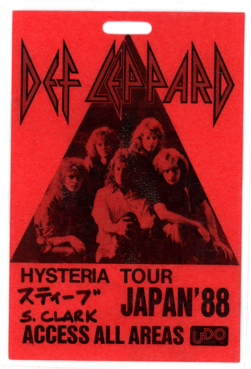 Steve Clark's all-access laminate for the Hysteria World Tour in Japan, 1988. The band were amazed by the Japanese fans. Steve used to receive hand-crafted dolls in his likeness from them, thrown onstage or handed over whenever possible. He was touched by the sweetness of fans who cared so much to make such intricate and thoughtful gifts for the band. Courtesy of the Lorelei Shellist Private Collection.