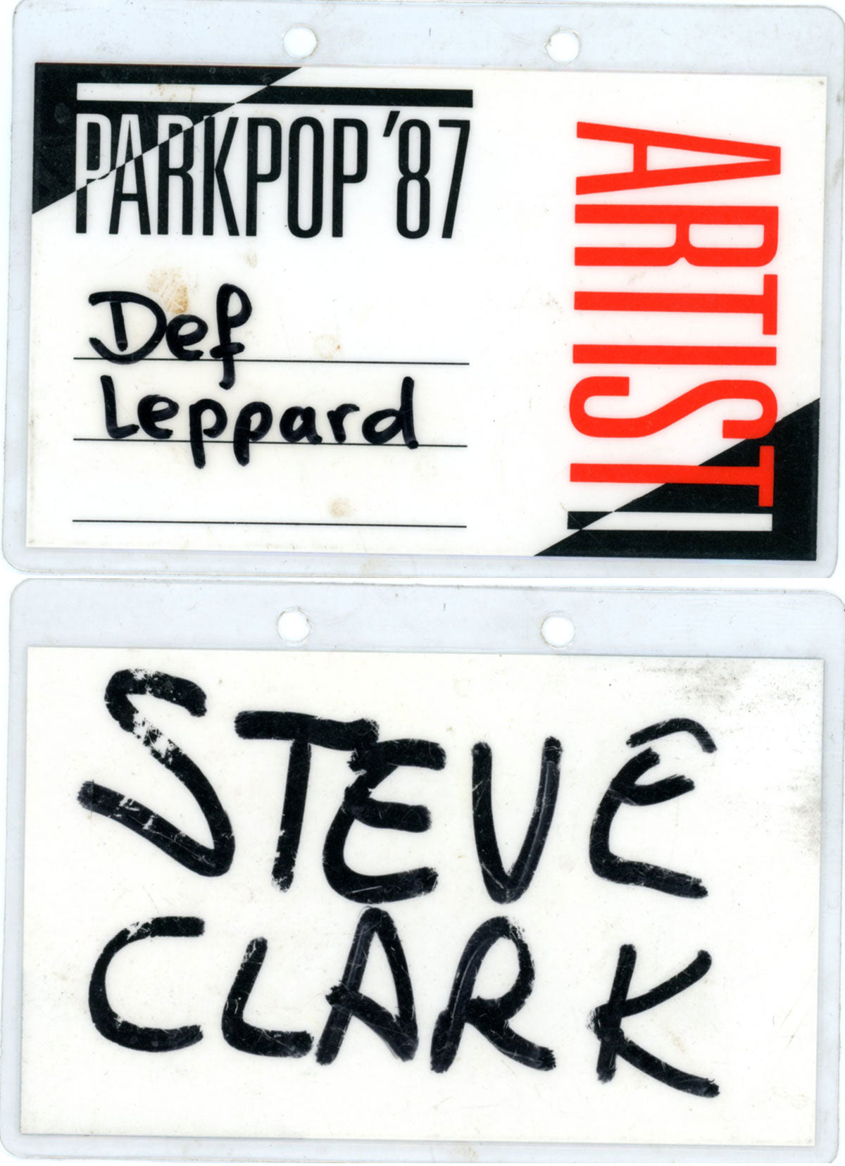 Steve Clark's All-Access laminate pass for the Parkpop Festival in DenHaag, Holland on 28 June, 1987. The band played 2nd stage at this outdoor free festival as a warm-up to the Hysteria tour. Courtesy of the Lorelei Shellist Private Collection.