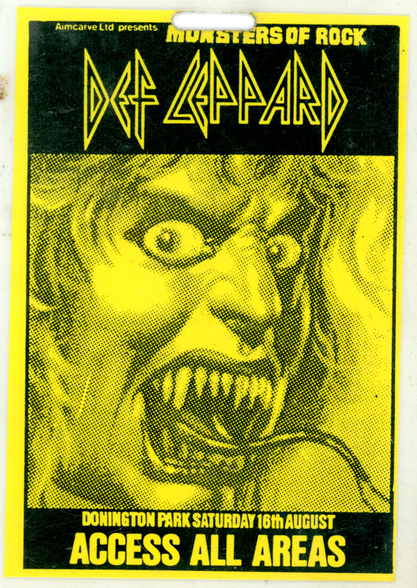 The Return of the Thundergod! A Def Leppard Access All Areas pass for the massive 1986 Monsters of Rock show at the Donnington Park race track, next to the village of Castle Donington in Leicestershire, England. The blazing line up for the day included Ozzy Osbourne, Scorpions, Mötorhead, Bad News, Warlock, and of course Def Leppard. This show was particularly important as it marked Rick Allen's triumphant return to the stage after his accident. He had a few warm-up shows in Ireland, then onto Donnington for 80,000 fans. Joe says "the cheering was so loud they practically blew us off the stage." Legendary. Courtesy of the Lorelei Shellist Private Collection.