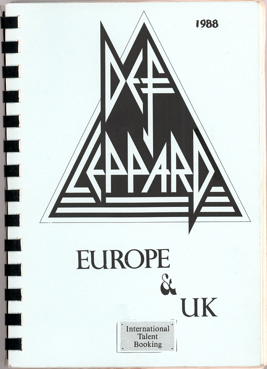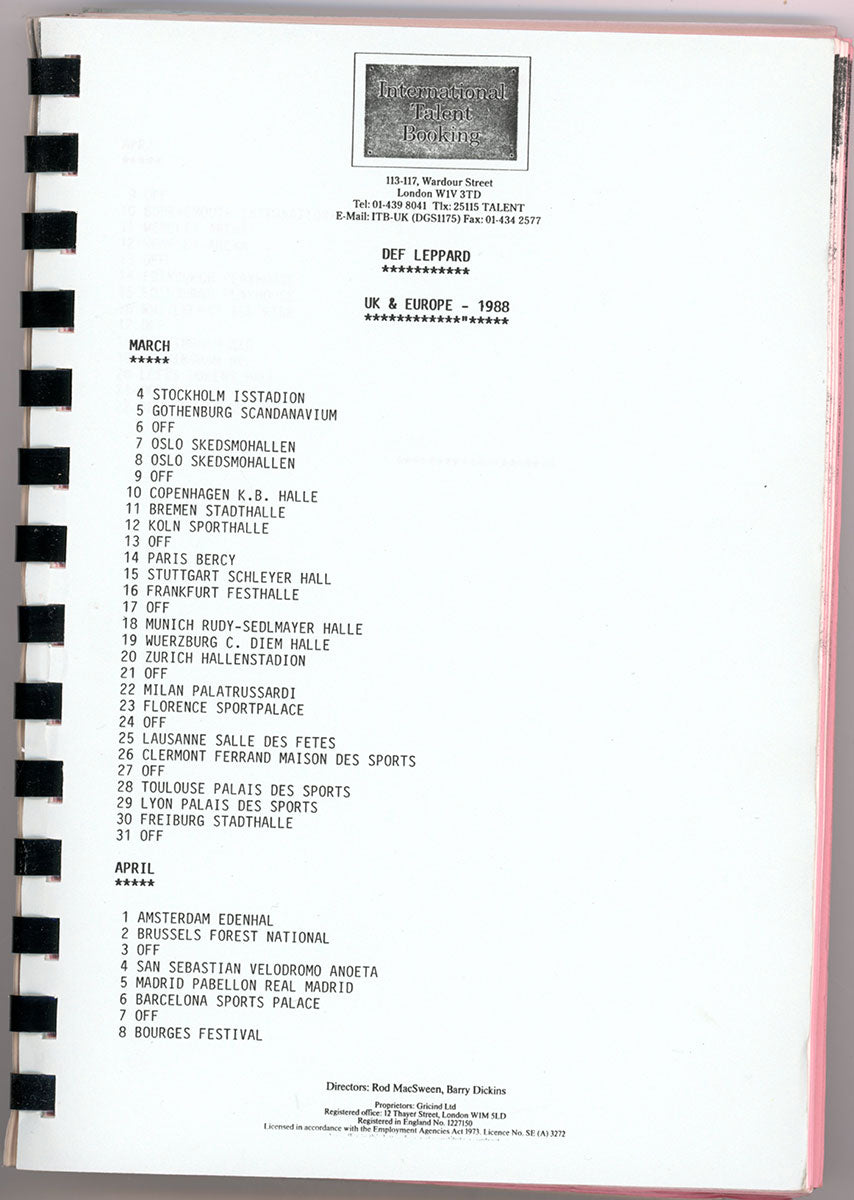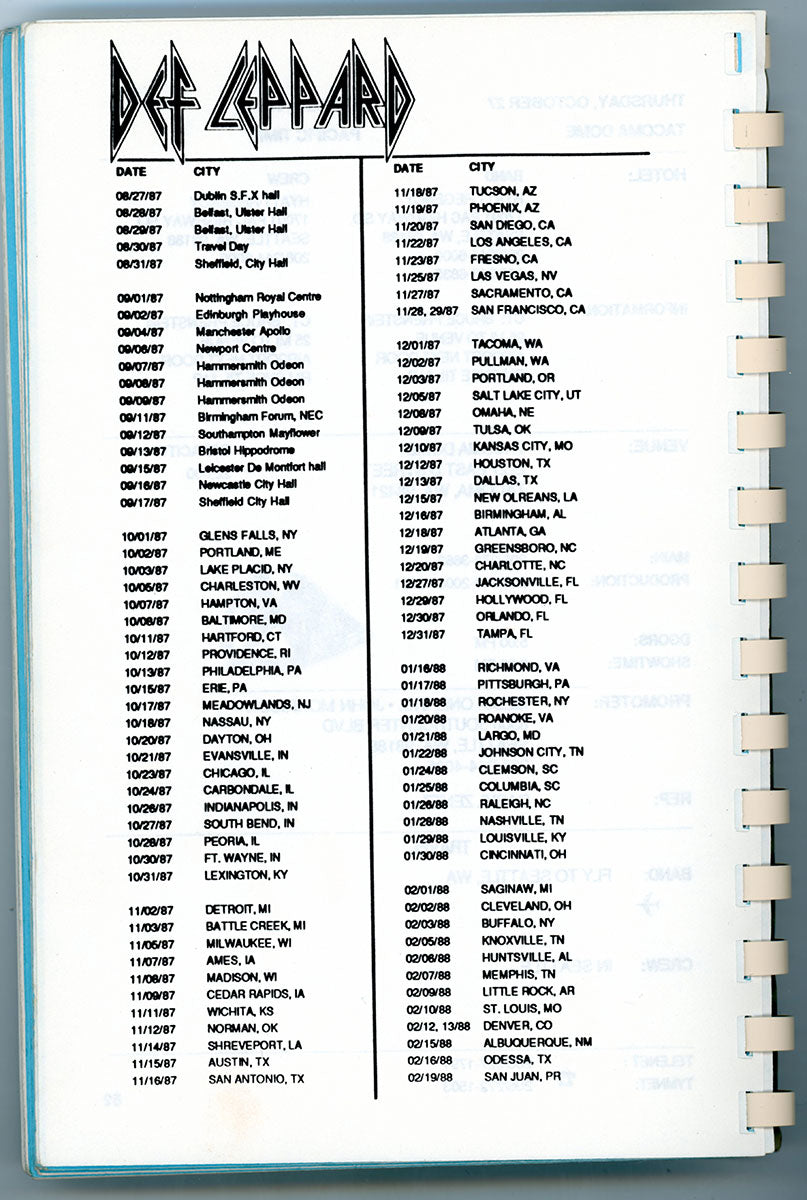 Amazing. Steve Clark's personal Tour Book for the December 1987 and January 1988 dates of the epic, world-hopping, year-long adventure that was the Hysteria tour (now nicknamed "Panic in the Round.") This spiral-bound booklet contains details for the leg of the tour covering dates in Europe and the UK. You'll find dates, venues, sound check and performance times, travel routes, hotels, and days off - everything the band needed to know to get to the gig on time. Handwritten notes from Steve Clark and Lorelei Shellist inside with contacts and flight info. A detailed look at a thrilling time in Def Leppard history. Courtesy of the Lorelei Shellist Private Collection.