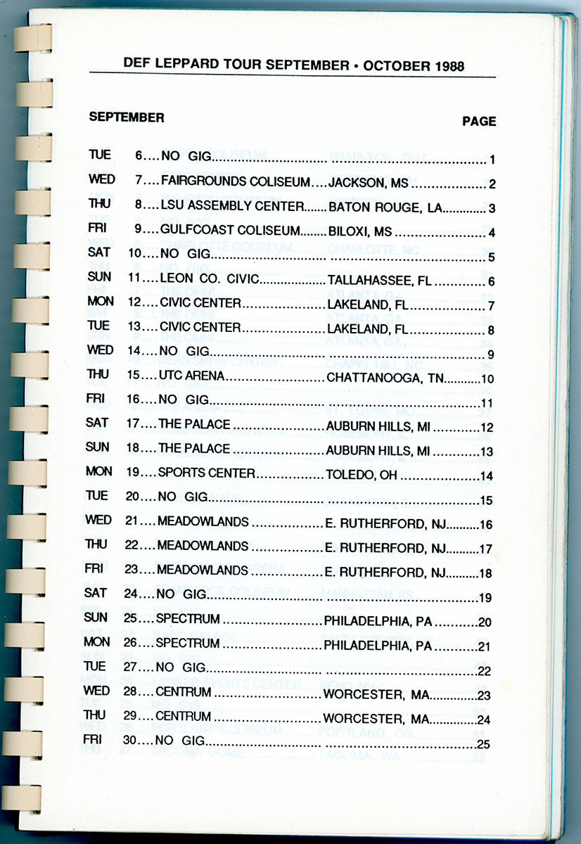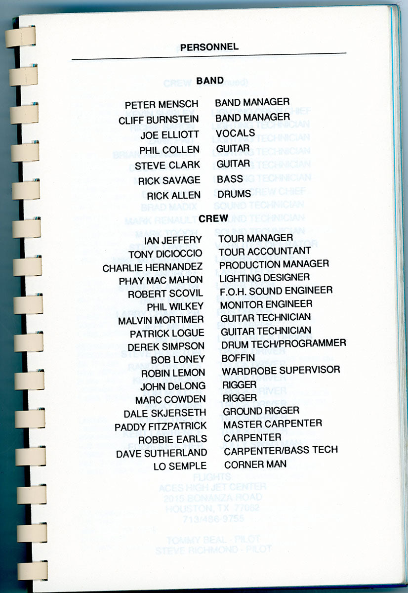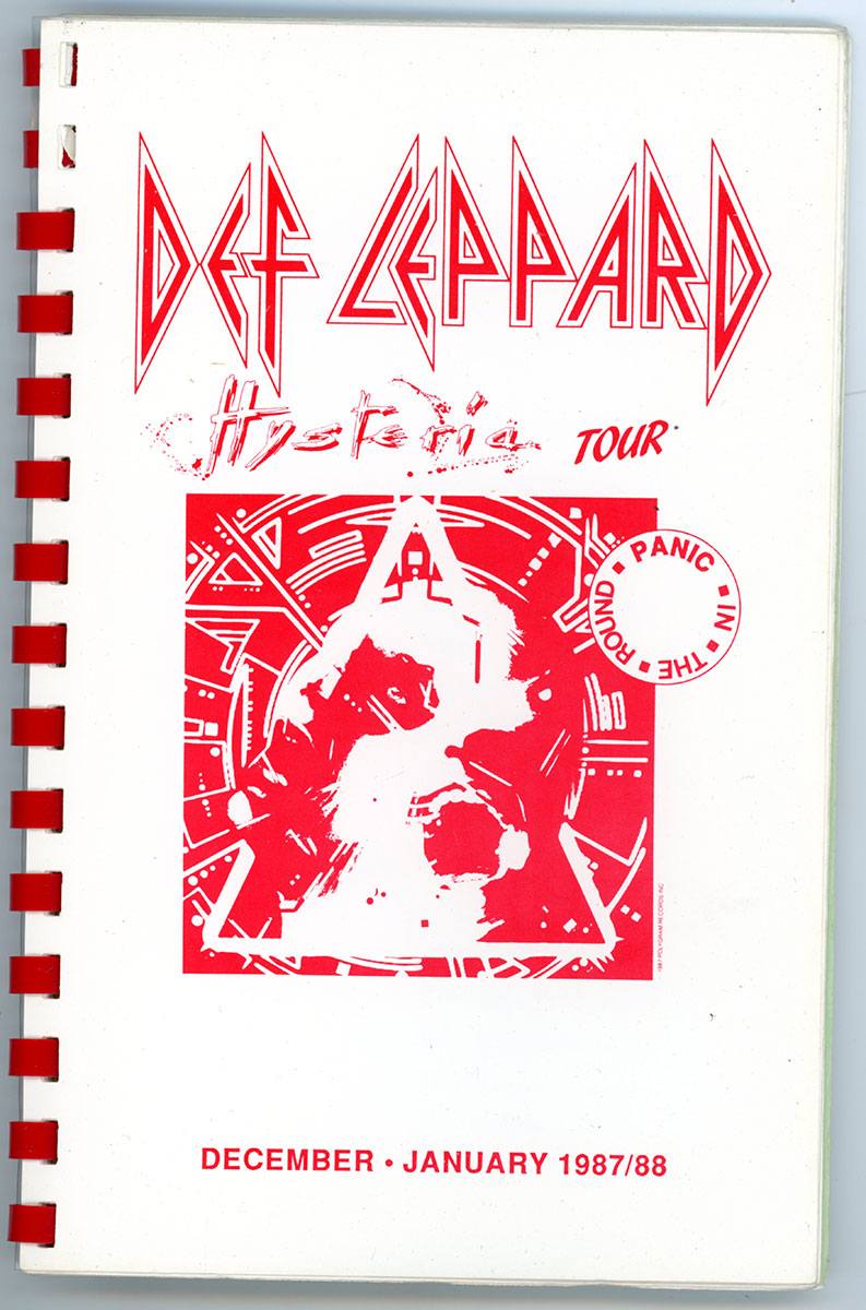 Steve Clark's personal copy of the Hysteria World Tour Itinerary Book for the US/Canada leg, 1988. This spiral bound itinerary includes tour dates/locations, personnel roster, and a triumphant congratulatory letter from one known as "Fearless Leader." Steve undoubtedly thumbed through these pages time and again, looking over the stops that had been, and the stops yet to come. Reading the itinerary gives a peek at the inner-workings of this wild, in-the-round, nowhere-to-go-but-under-the-stage mega-tour that was Hysteria. Can you feel it? Do you believe it? Courtesy of the Lorelei Shellist Private Collection.