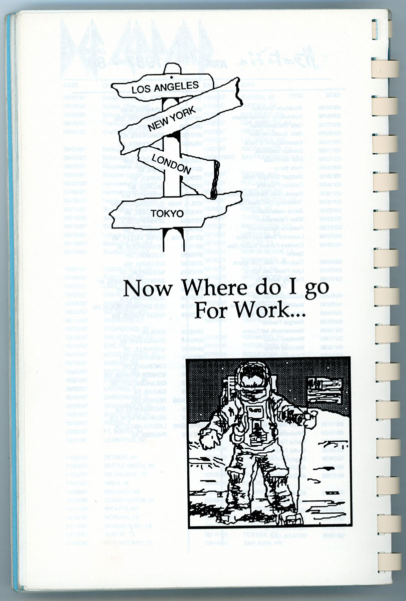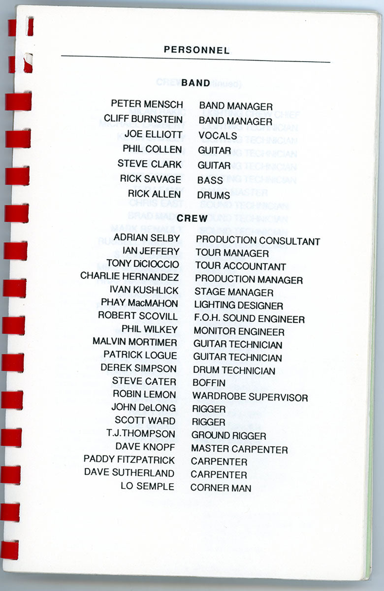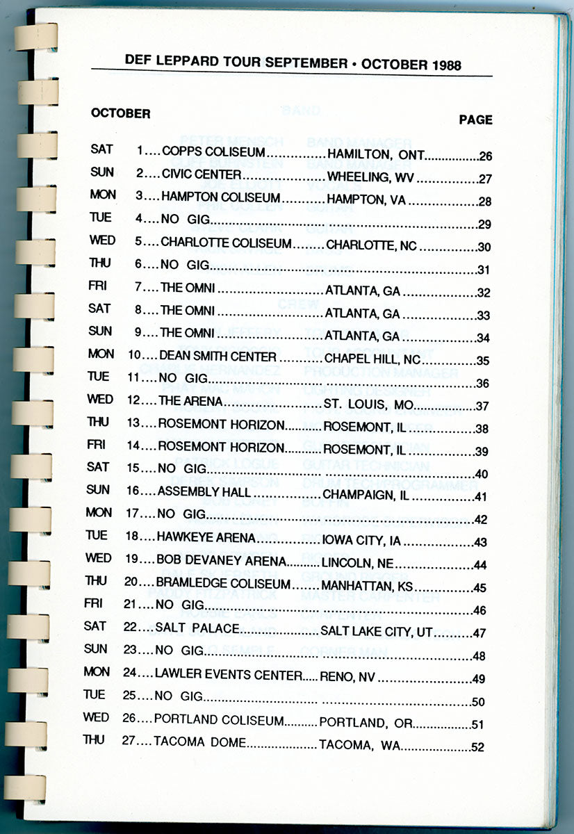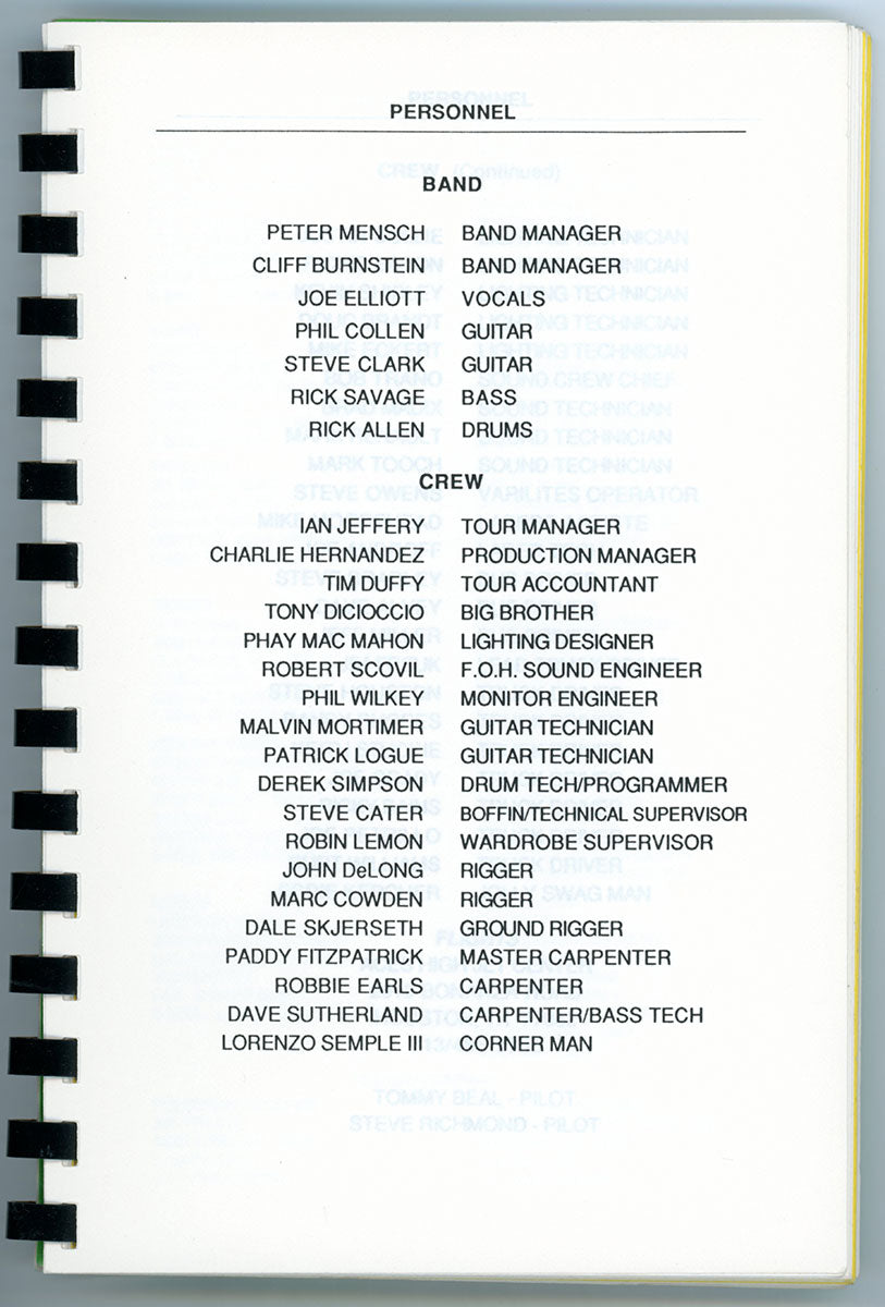 Steve Clark's personal copy of the Hysteria World Tour Itinerary Book for the US/Canada leg, 1988. This spiral bound itinerary includes tour dates/locations, personnel roster, and a triumphant congratulatory letter from one known as "Fearless Leader." Steve undoubtedly thumbed through these pages time and again, looking over the stops that had been, and the stops yet to come. Reading the itinerary gives a peek at the inner-workings of this wild, in-the-round, nowhere-to-go-but-under-the-stage mega-tour that was Hysteria. Can you feel it? Do you believe it? Courtesy of the Lorelei Shellist Private Collection.