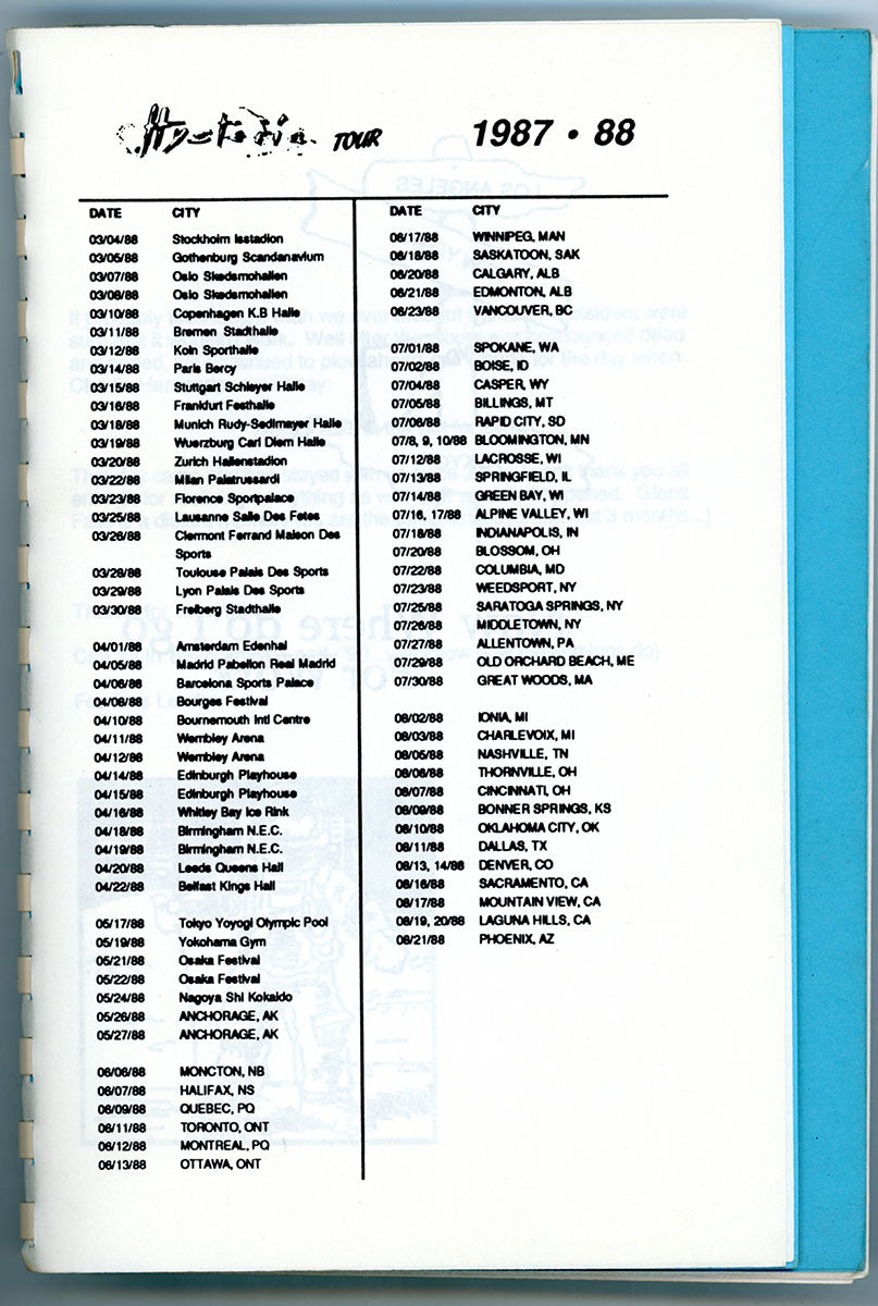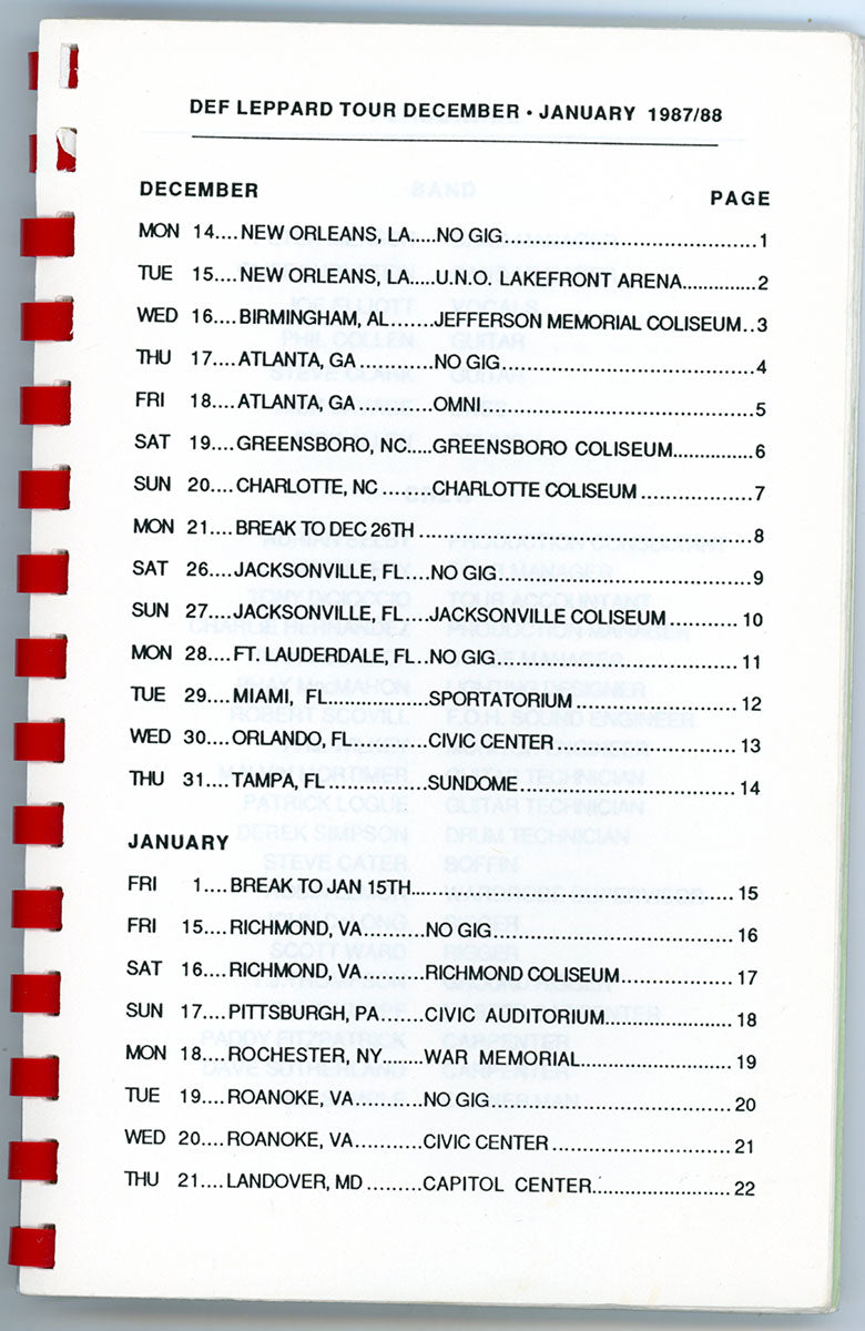 Behold Steve Clark's personal Hysteria Tour Itinerary Book detailing December 1987 into January 1988! The tour at this time was also nicknamed "Panic in the Round." The booklet contains venue dates and locations, tour personnel, monthly calendars - everything the boys needed to be at the right place at the right time, early in the tour's trajectory. One fascinating and priceless addition. Courtesy of the Lorelei Shellist Private Collection.