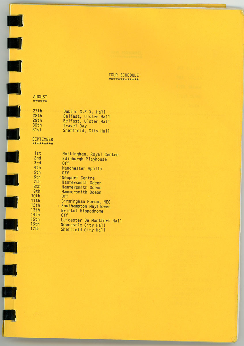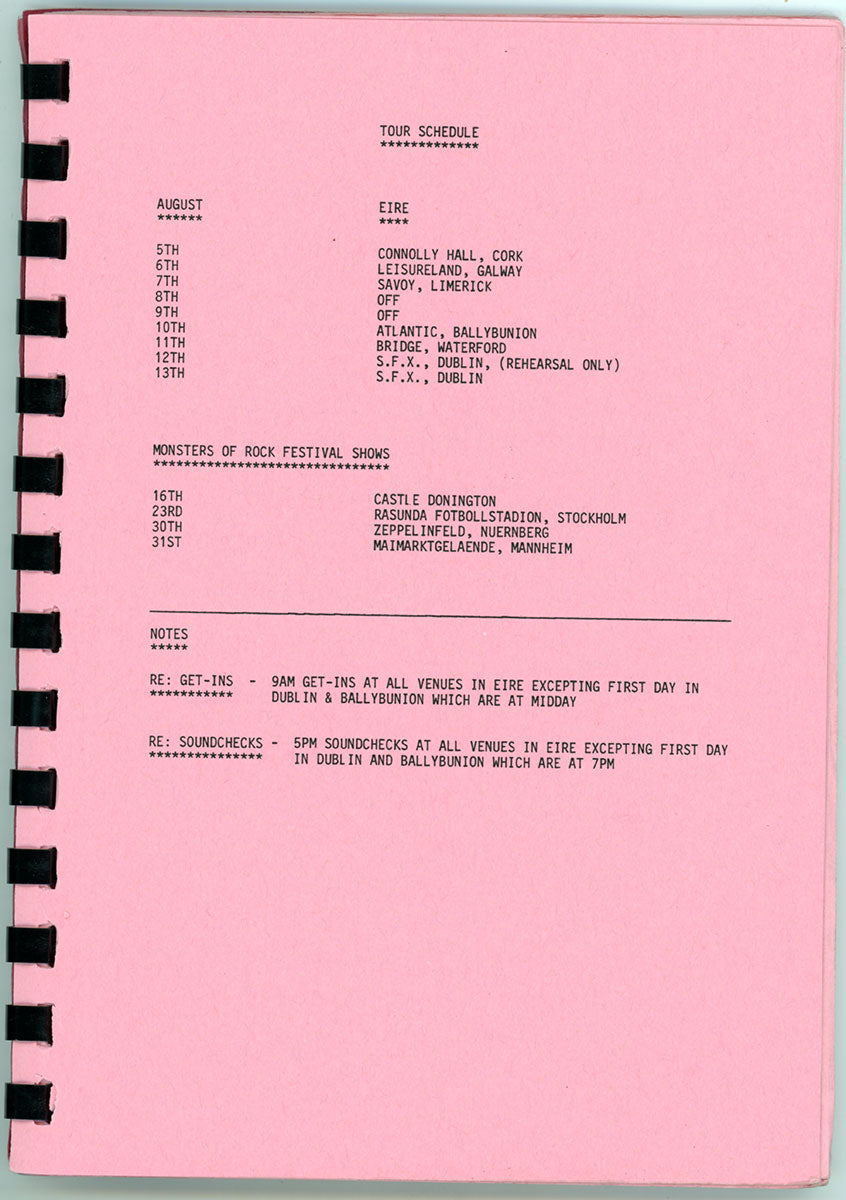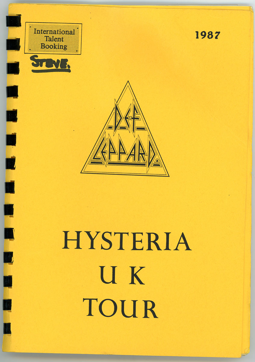 Amazing. Steve Clark's personal Hysteria Tour Itinerary Book for the kick-off dates of an epic, world-hopping, year-long adventure, beginning with that very first warm up show in Dublin S.F.X Hall, 27 August,1987. This spiral-bound booklet contains details for all of the Ireland/England leg of the tour, including dates, venues, sound check and performance times, travel routes, hotels, and days off. It also offers a little gem of advice, as surely the team was nervous, not knowing how the tour would be received. "Don't worry over what other people are thinking about you, they are too busy worrying about what you are thinking about them!" Words to live by. Courtesy of the Lorelei Shellist Private Collection.