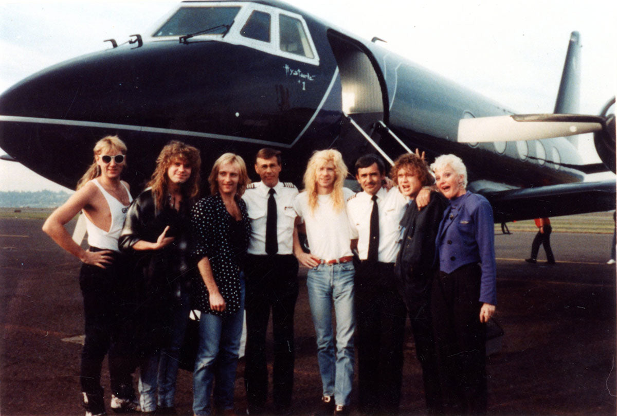 This photograph captures the band and flight crew in front of the fabled "Hystouria #1" plane (legend has it that it was once owned by Elvis Presley) in the Summer of 1988, their first time to tour by air. This iconic "band meets plane" picture was taken at the insistence of photographer Ross Halfin, because "it's just what you do." From Elvis to Def Leppard, that plane was fueled with rock 'n roll, and thanks to Halfin we have this snapshot to prove it. Courtesy of the Lorelei Shellist Private Collection.
