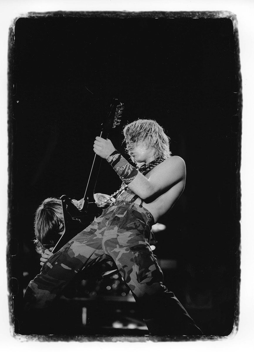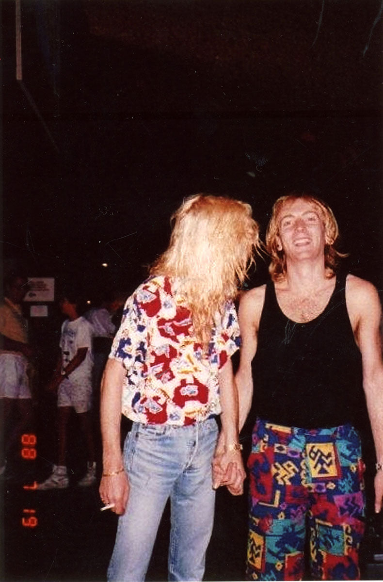 A rare shot of Steve Clark and Phil Collen post-Hysteria performance, as they emerged from under the stage once the audience had cleared the building. Phil recalls: "Obviously by the bewildered look on our face, we have no clue where we are. No, that's after one of the in-the-round shows on the Hysteria tour. Because we would have to go under the stage, and wait for the audience to leave. So you'd be covered in sweat. Sometimes we'd do a three-hour show, or a two and a half-hour show. You'd be dripping, and it got chilly in some of these [venues]. AC and all of that. So we would sit underneath and have to wait for the arena to file out. So we had these big furry slippers - moose slippers and these really thick robes, these fluffy robes that would keep us warm, and then we'd sneak out. We'd just walk out like that. And we would get to the stage by getting in laundry hampers. Me and Sav used to share a laundry hamper, and Steve and Joe used to share the other one. Rick used to go out disguised. He'd have a fake arm and, and a baseball cap, and he'd go out earlier. So he could play along to the opening act. So yeah. And then afterwards, we'd all sit there and, and dress up like this." Color photo print from the Arco Arena in Sacramento, CA. Courtesy of the Lorelei Shellist Private Collection.