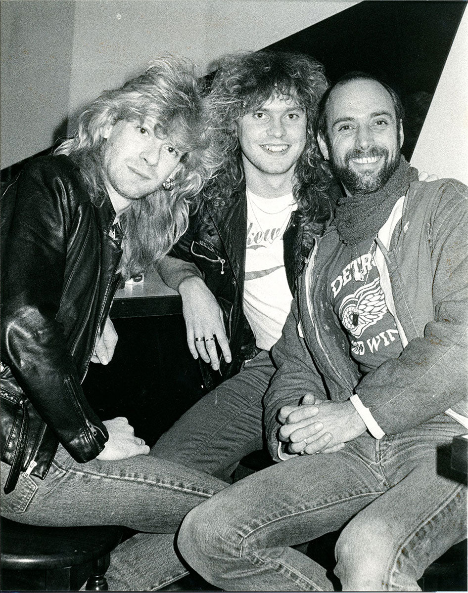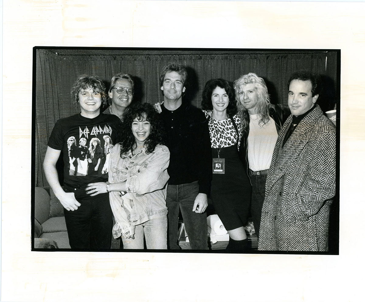 Rick Allen with Bon Jovi drummer Tico Torres (left) and Jon Bon Jovi (center) having a laugh, circa 1988. Bon Jovi and Def Leppard go way back. Joe Elliott regales us with a tale about a night out with the two mega-bands: "We'd found out that Bon Jovi were in town, recording, New Jersey, I think. And so there wasn't a lot of work done in both camps in fairness, because we were hanging out and doing stuff. And I remember one night when we were in Vancouver... I don't know who he was fighting, but Mike Tyson was having one of his many title fights. And the promoter that we normally use in Canada hired a nightclub for us and Jon and the boys to basically hang out and go watch the Tyson fight on this big screen. And he put on this little band that were playing live. The Killer Dwarfs were playing, and we were expected to get up and jam and all this kind of stuff, which we did. Me and Jon got up and sang a couple of songs together. But the Tyson fight lasted like a minute thirty. He just came out like a bat out of hell out of the corner. Bang, over. So it wasn't much of a spectacle as a fight, but it was a great night out." Color 4x6 photograph. Courtesy of the Lorelei Shellist Private Collection.