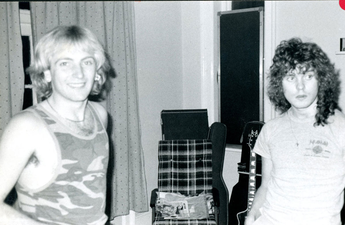 Steve Clark and Phil Collen together on a plane during the Pyromania tour, somewhere in Europe. Phil gives a little background to these particular sunglasses, and his iconic military surplus look of this tour. 8x10 black and white photo print. Courtesy of the Lorelei Shellist Private Collection.